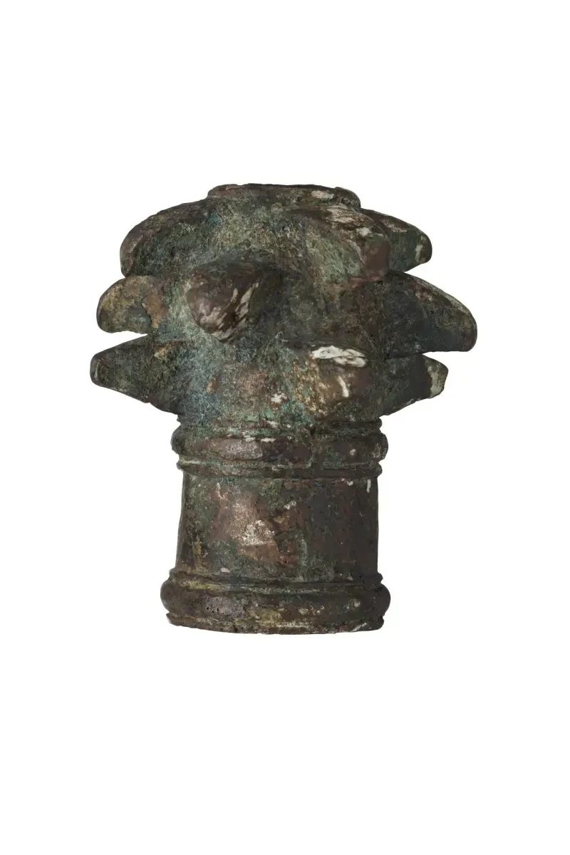 Уже в эпоху бронзы наряду с каменными навершиями появились и отлитые из бронзы. Причем мастерство литейщиков было таково, что многие из них отливались пустотелыми. Отливали столь сложные изделия, скорее всего, методом «потерянной формы», то есть лепили образец из воска, а потом обмазывали глиной, воск вытапливали и заливали расплавленный металл… Некоторые образцы таких наверший, изготовленные в Средневековье, являются настоящими произведениями искусства.