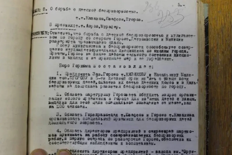 А вот это очень интересный документ. «О борьбе с беспризорниками». Но вот откуда они появились? Ведь гражданская война закончилась в 1922 году. В 20-ые годы с беспризорностью велась очень активная борьба. И вот опять появились беспризорники, да еще в таких масштабах, что их обсуждали на уровне горкома…