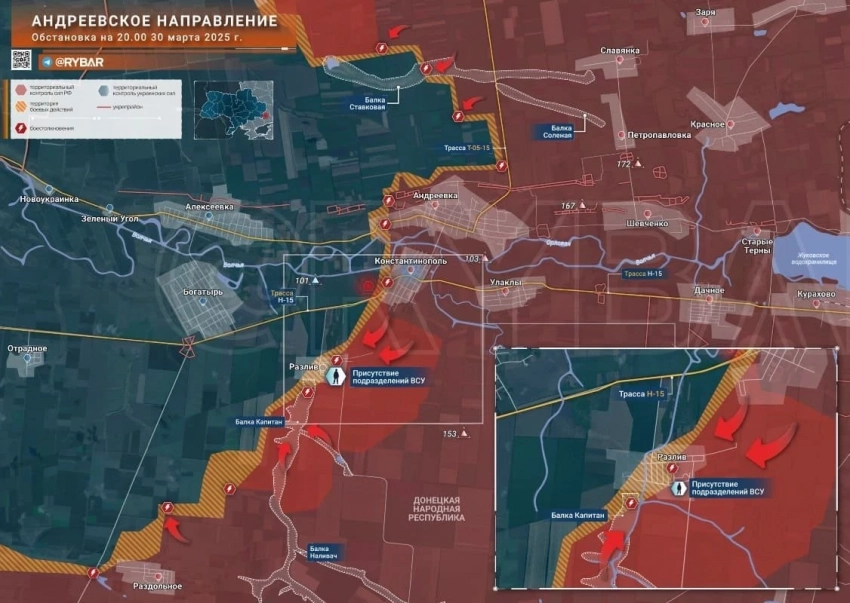 На западном фланге Торецкого участка ВС РФ наступают по линии Александрополь-Сухая Балка. От Пантелеймоновки наши вышли на окраины Валентиновки. На северо-западе от Торецка ВС РФ закрепились в южной части лесного массива, что позволяет давить на Щербиновку с фланга и при этом держать логистику посёлка под плотным огневым контролем. Кроме этого, наши заняли часть укреплений на юго-западе от Торецка. А на правом фланге наши пробиваются от Дачного к Дылеевке, расположенной за железной дорогой.