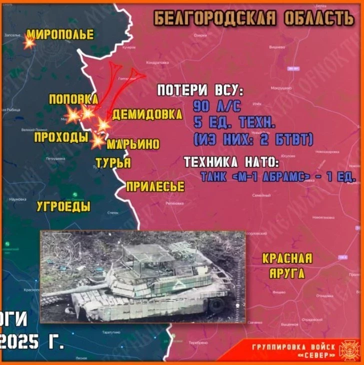 Военный корреспондент Павел Белый сообщил о непрекращающихся столкновениях на белгородском участке государственной границы. По его данным, боевые действия ведутся круглосуточно, а противник предпринимает неоднократные попытки прорыва. Ночью небольшие пешие группы Вооруженных сил Украины пытались пересечь границу, однако все они были оперативно уничтожены российскими силами. С утра активность врага усилилась: к рубежу выдвинулись штурмовые подразделения, поддерживаемые бронетехникой. В ходе одного из таких наступлений южнее села Турья в Сумской области был подбит американский танк Abrams.