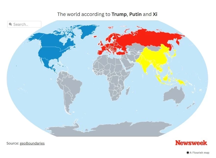 Президент России Владимир Путин, американский лидер Дональд Трамп и глава Китая Си Цзиньпин поделят мир на сферы влияния после завершения конфликта на Украине, пишет журнал Newsweek. Издание даже опубликовало цветную карту будущего нового мирового порядка.