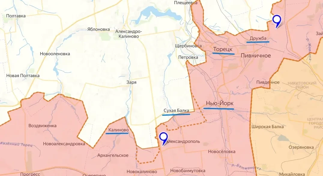 Подразделения ВС России «срезали» выступ на линии обороны ВСУ между Сухой Балкой и Нью-Йорком (пгт Новгородское) на Дзержинском направлении ДНР (украинское название Дзержинска – Торецк). Противнику пришлось с боями отойти за трассу, соединяющую Новгородское (Нью-Йорк) и Калиново.