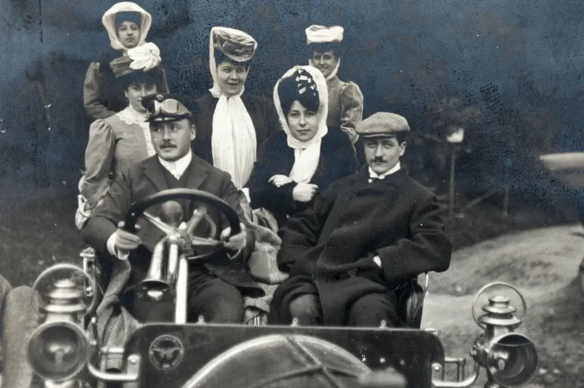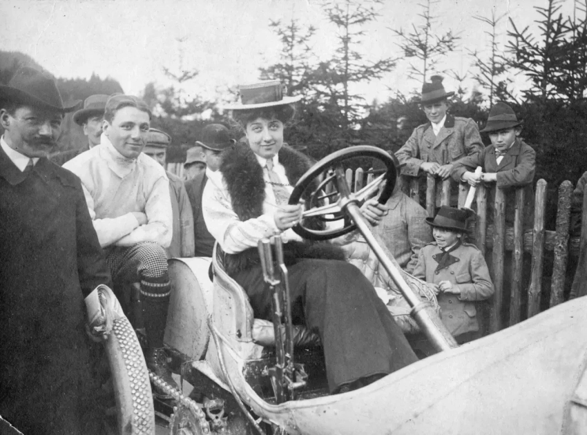 Фотография новоиспеченной семьи, сделанная в 1909 году. Поездка с друзьями: Mercédès сидит в самом заднем левом углу, ее муж Карл фон Шлоссер — рядом с водителем.