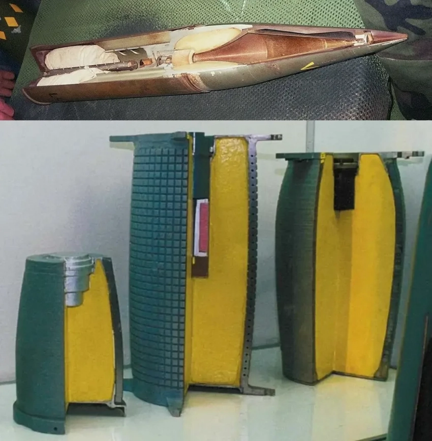 Кумулятивный боеприпас (вверху) и осколочно-фугасный боеприпас (внизу)