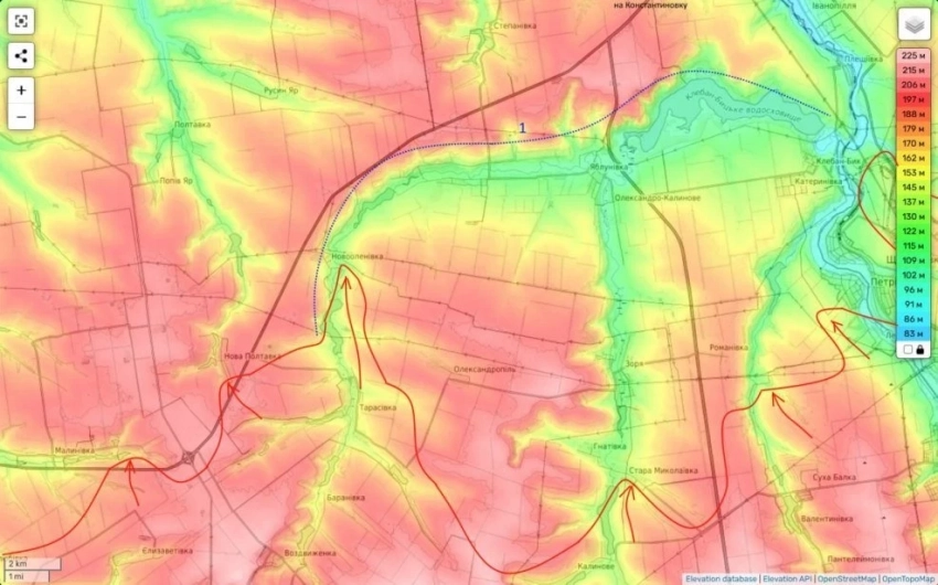 Успех здесь во многом обнулит линию обороны ВСУ на реке Бычок (обозначена цифрой «1»).