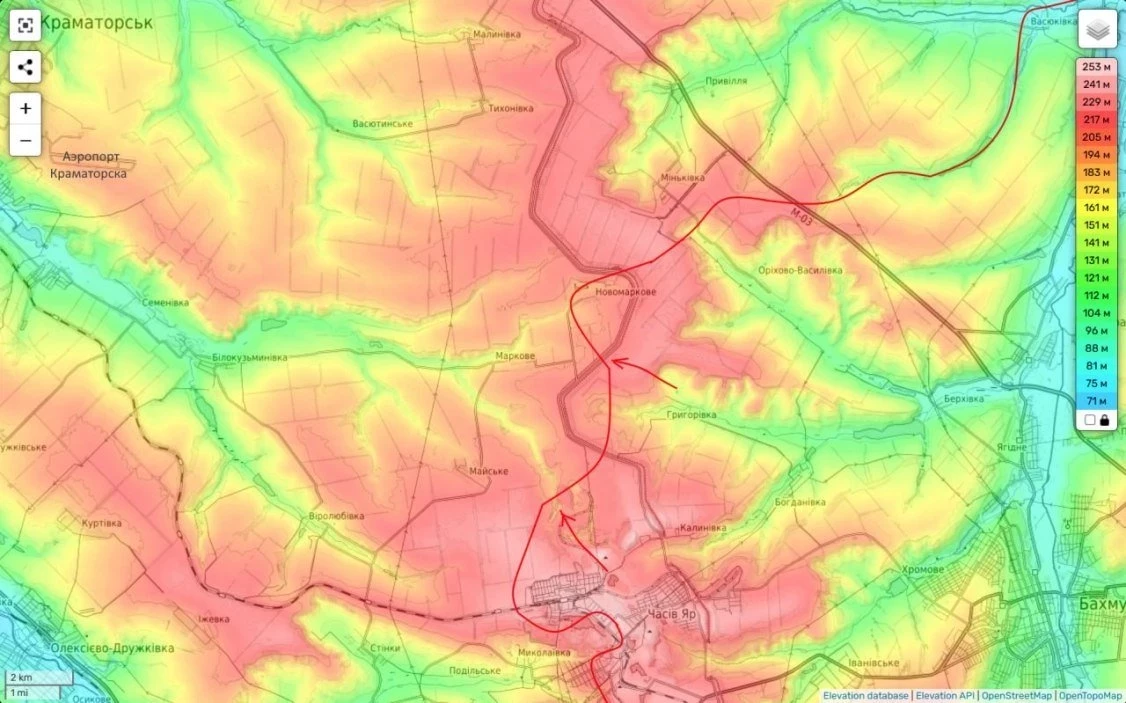 Что позволяет говорить о формировании нового направления, глобальной задачей которого является выход на восточные окраины Краматорска (в район местного аэродрома, который является преобладающей здесь высотой и с которого можно легко работать дронами не только по городу, но и обрезать его логистику при их помощи.