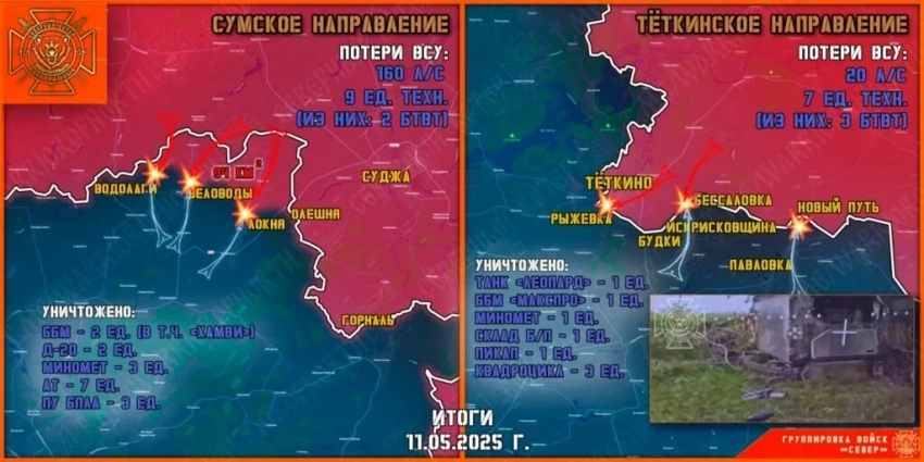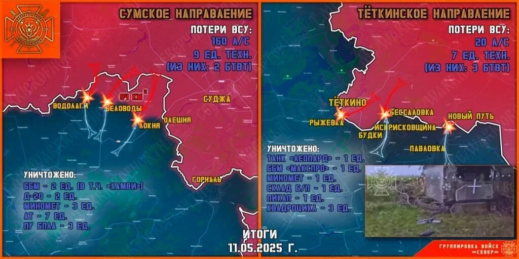 Также «Северный ветер» рассказал, что 11 мая группировка войск «Север» уничтожала передовые, инженерные и штурмовые подразделения ВСУ на Теткинском и Глушковском направлениях в Курской области.