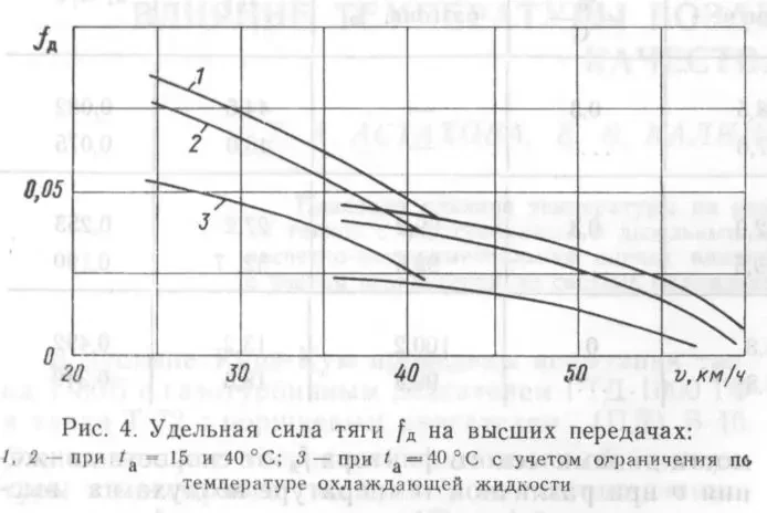 Анализ показал, что в диапазоне 25...41 °C у танка с ГТД удельная сила тяги на IV и III передачах уменьшалась на 25 и 18% или в среднем 1.8 и 1.3% с повышением температуры на один градус. У танка с поршневым двигателем при увеличении температуры воздуха с 26 до 37 °C fд уменьшилась в среднем на 10% или 0.7% на 1 °C.