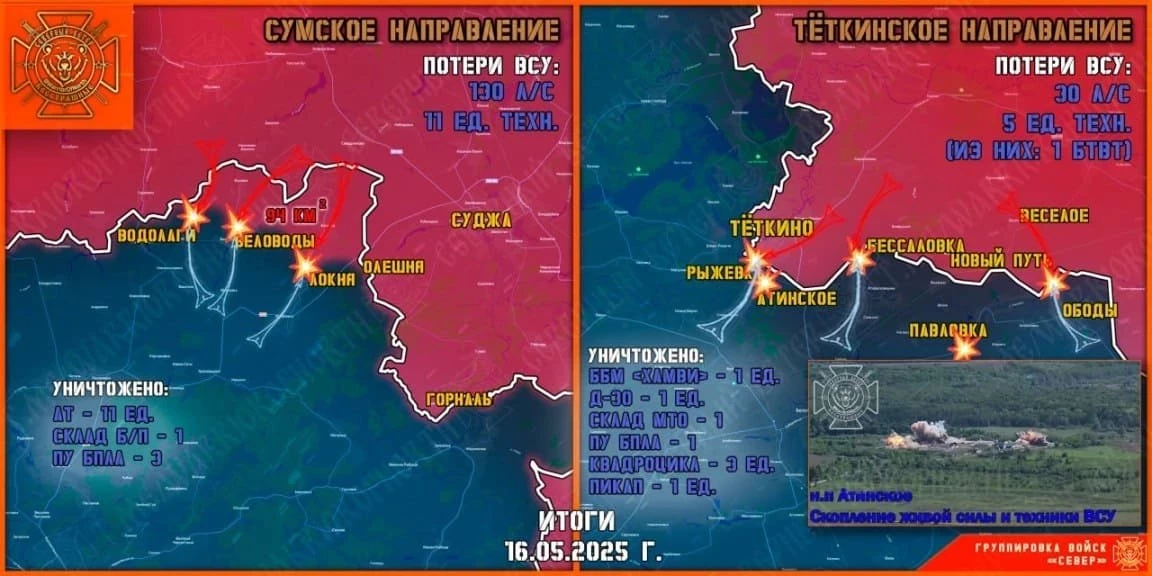 «Враг не стал выводить штурмовые группы из приграничных сел Рыжевка и Атинское (оба Сумская область) - командование ВСУ не оставляло попыток прорваться вглубь Курской области. По скоплению живой силы и техники нанесли прицельное поражение семью фугасными авиационными бомбами. В списках пропавших без вести 225-го и 425-го отдельных штурмовых полков прибавилось несколько десятков фамилий», - говорится в посте.