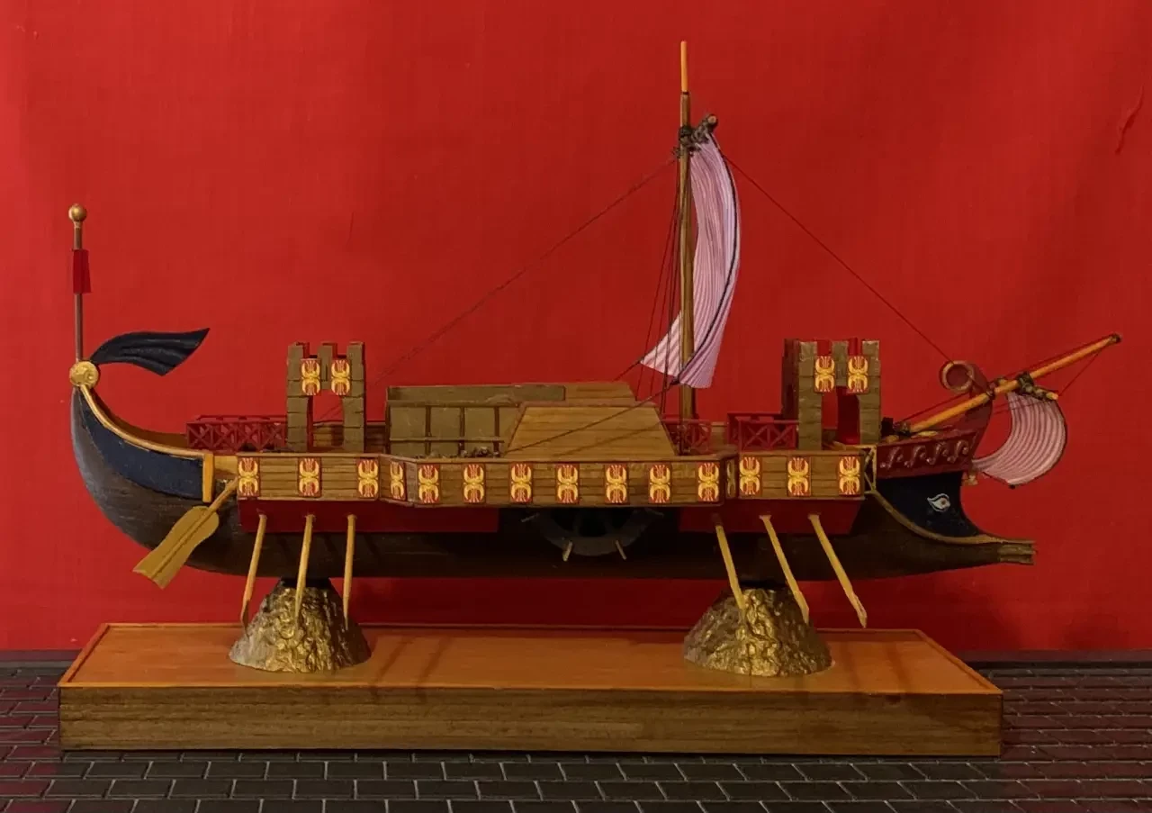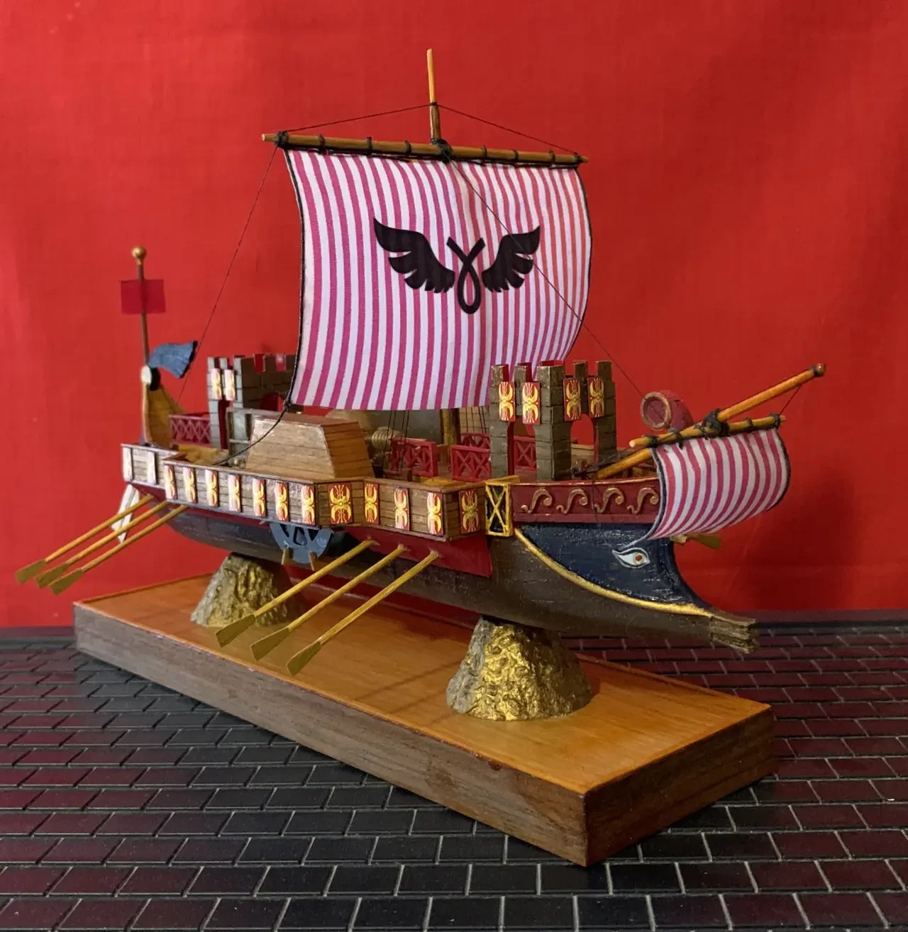 Вот она, полностью законченная модель гипотетического судна Герона. Пришлось подождать, пока не придут декали на щиты, которые в то время размещались по бортам боевых кораблей. Ну, а потом нужно было время, чтобы и декали на них перевести, и сами щиты вырезать… Фотография автора