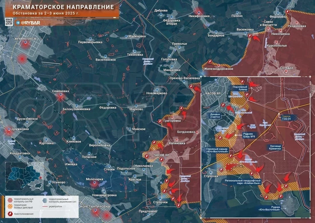 Западнее Торецка направления противнику удалось стабилизировать фронт на рубеже Полтавка - Русин Яр за счет стянутых сюда резервов, там пока без продвижения. А в Яблоновке есть успехи как внутри села, так и севернее и южнее от него. Туда же стремятся наши части со стороны Александрополя - им осталось до границ села 2,5 км. К северу от Торецка позиционные бои, пишет Олег Царёв в Telegram-канале.