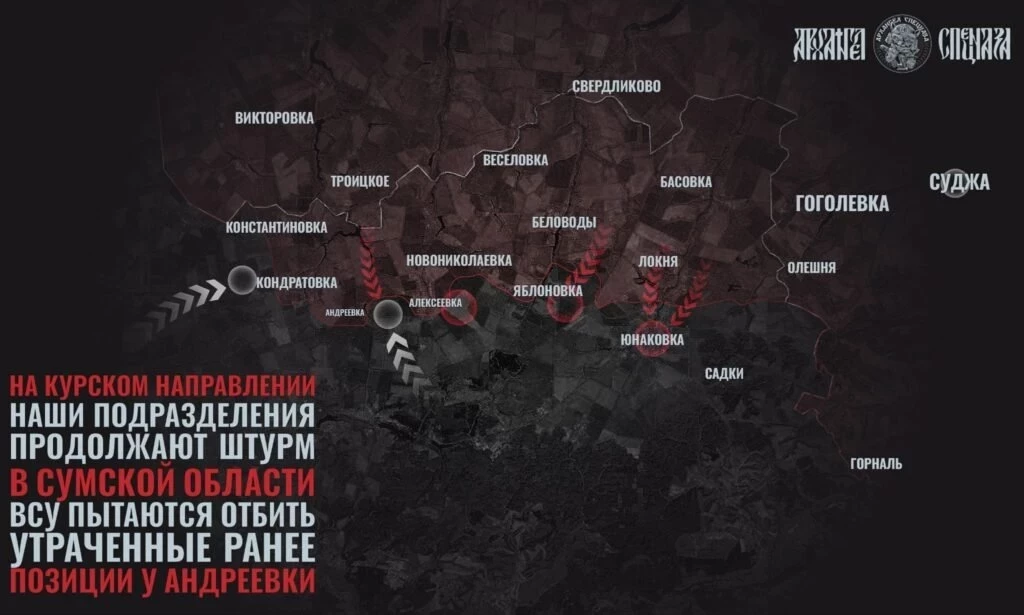 На Сумском направлении ВС РФ отбили несколько атак на Тёткино и Новый Путь в Курской области. В Сумской по линии Кондратовка – Алексеевка - Юнаковка за сутки враг предпринял до 20 контратак. ВСУ стягивают сюда резервы, используют артиллерию и дроны чтобы сбить темпы наступления ВС РФ. Тем не менее, под контролем ВС РФ уже до половины Юнаковки, есть продвижение восточнее села, в районе Садков.