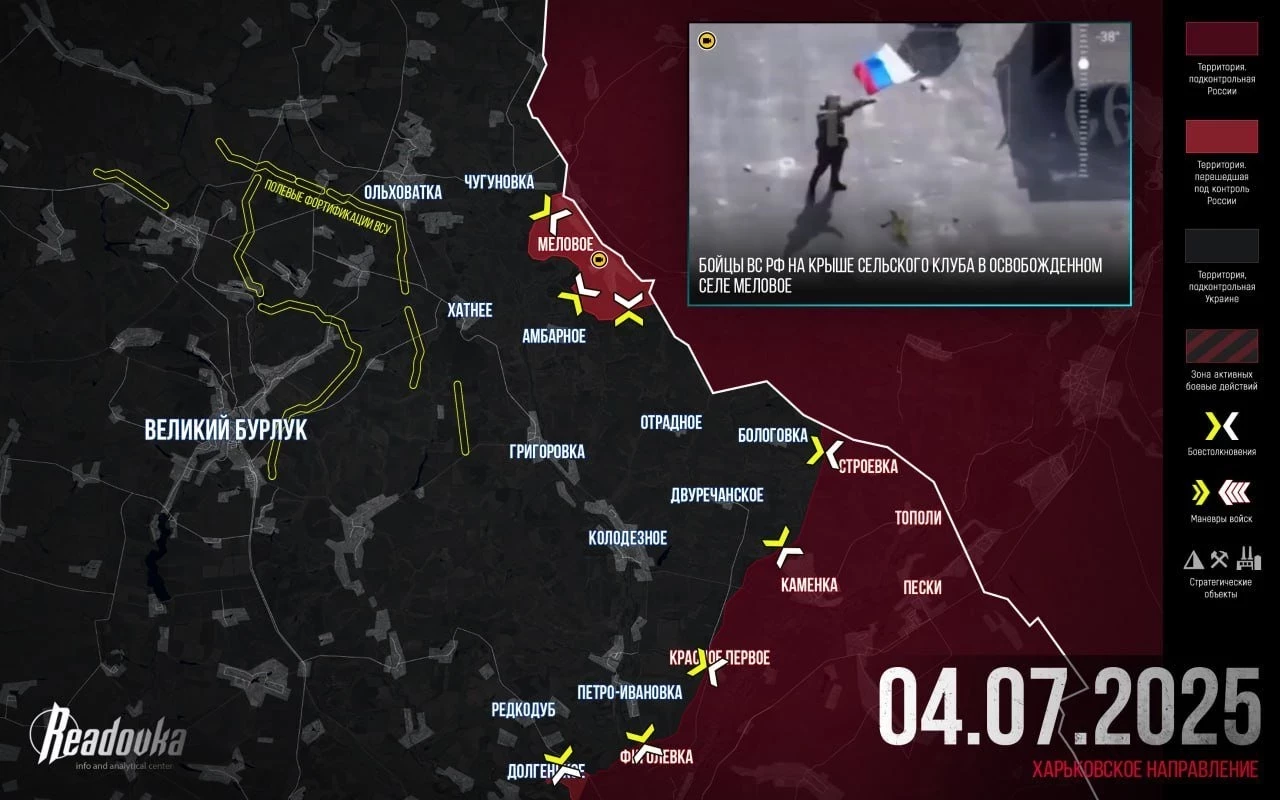 На Купянском направлении ВС РФ расширили подконтрольную территорию в районе Мелового. Сообщают также о расширении зоны контроля к западу от Строевки.