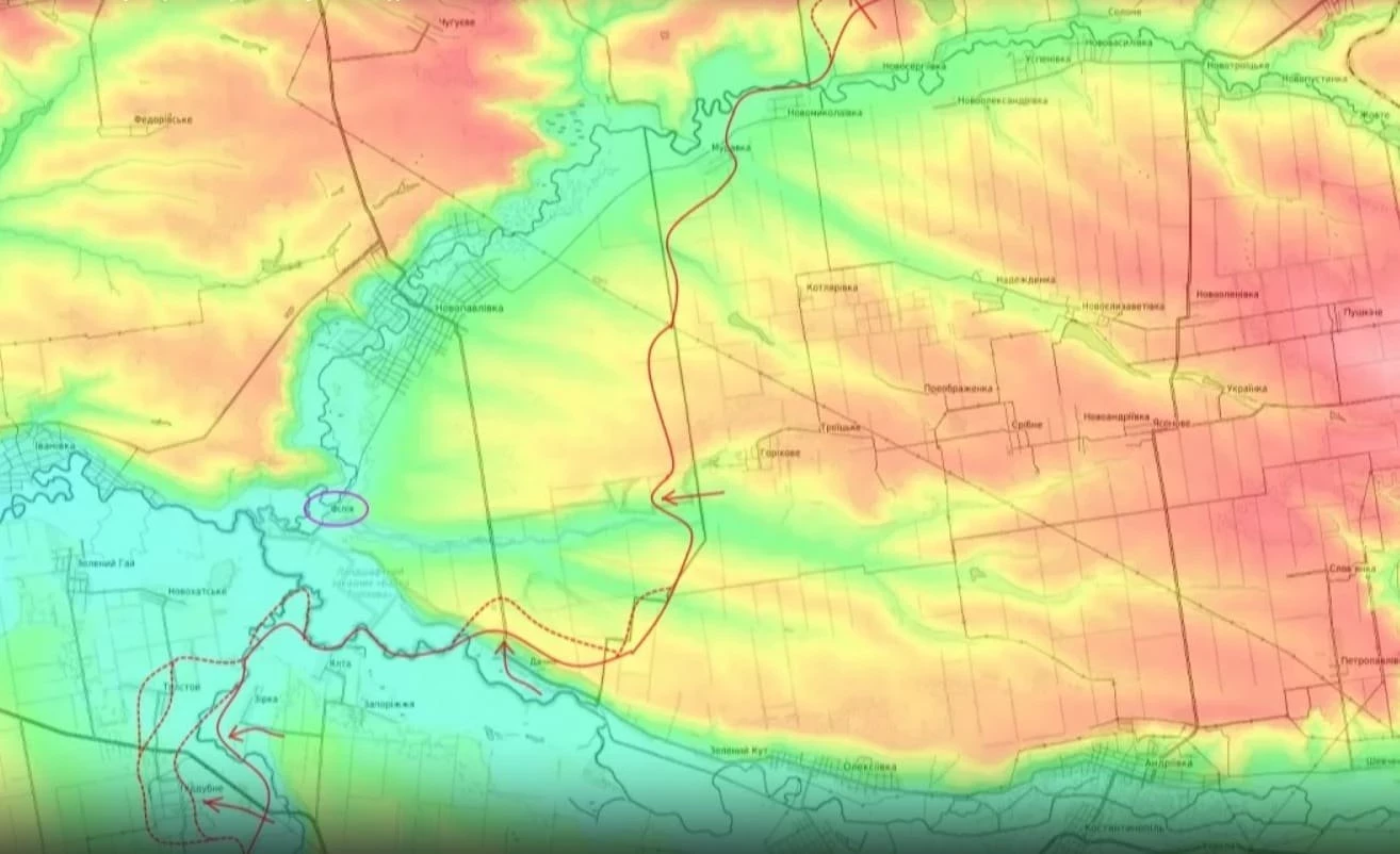Вместе с этим наши части движутся постепенно по лесополосам на Новопавловку с востока. Ожесточённые бои не смолкают за населённый пункт Муравка. На этом участке фронта украинские войска оказывают очень ожесточённое сопротивление.