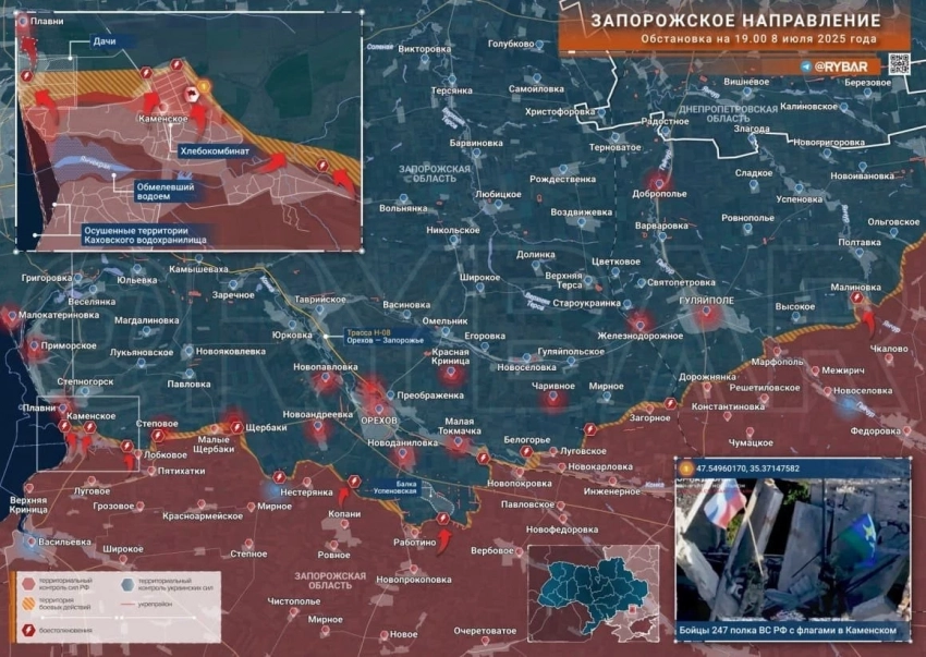 На Запорожском участке упорные бои в районе Каменского. Село фактически освобождено, но зачистка ещё продолжается. Артиллерия и дроны бьют по позициям противника в районе Плавней. Бои местного значения идут в районе Степового и Щербаков.
