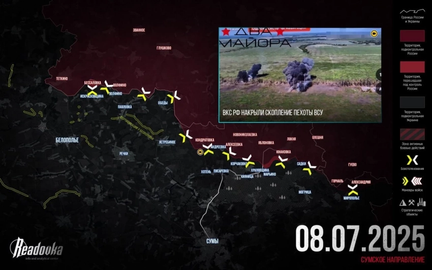 На Сумском направлении противник вновь контратаковал в районе Тёткино. В районе Юнаковки не стихают бои. Сообщают, что ВС РФ зацепились за окраины Варачино.