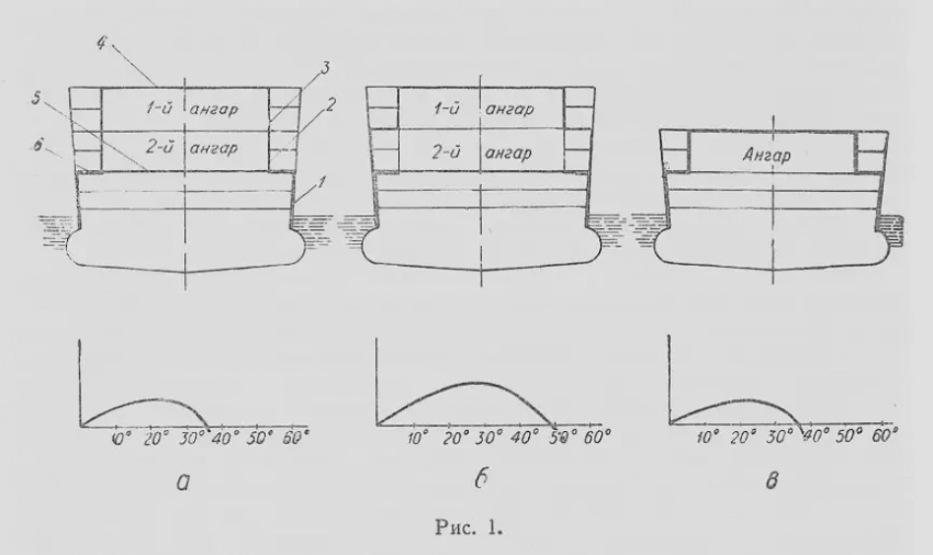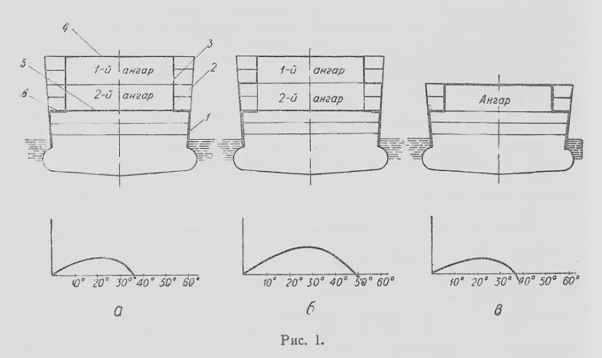 Схема «б», изображенная на рис. 1, с точки зрения боевой непотопляемости имеет существенные преимущества по сравнению со схемой «а». Здесь бронирование продольных стенок нижнего ангара представляет собою уширение главного броневого пояса, что существенно (на 5-6 м) увеличивает высоту бортового броневого пояса и, следовательно, увеличивает угол вхождения в воду его верхней кромки. Таким образом, вертикальная броня ангаров является как бы вторым броневым поясом, защищающим не только ангары, но и бортовые коридоры и сходы во внутренние помещения. Положительное влияние, которое оказывает переход от внутреннего бронирования ангаров (схема «а») к наружному (схема «б»), может быть оценено сравнением диаграмм Рида, построенных для случая боевой остойчивости, т. е. в предположении, что весь небронированный борт авианосца вследствие разрушений утратил водонепроницаемость. Как это нетрудно видеть, площадь диаграммы Рида для системы, показанной на схеме «6», примерно на 50 % больше, чем на схеме «а», а это означает, что авианосец, обладающий такой системой бронирования, сможет выдержать больший кренящий момент, вызываемый подводными повреждениями.