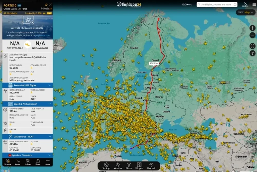 При этом Northrop Grumman RQ-4B Global Hawk проделал весьма немалый путь. Стартовал он, очевидно, с военно-морской базы НАТО в Италии Сигонелла, которую совместно эксплуатируют ВВС Италии и США. Посадку беспилотник совершил на севере Финляндии, двигаясь аккуратно вдоль границы РФ. Из российских крупных городов разведывательный БПЛА более всего приблизился к Санкт-Петербургу.