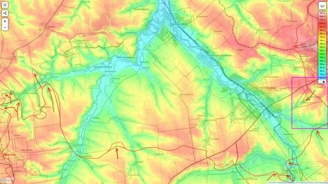 По мнению военного эксперта, ВС РФ вероятно «будут рубить кишку (ред. - оборону противника), которая растянулась на 100 км от Славянска через Краматорск до Дружковки».