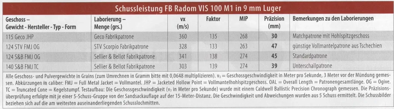 Отстрел проводился четырьмя сортами патронов с массой пули от 115 до 140 гран. Стрельба велась на дистанцию 15 метров с опорой на мешок с песком. Среднее рассеивание составило ок. 40 мм. Наилучшие результаты показали патроны GECO 115 гран с экспансивными пулями. Рассеивание составило 30 мм. На втором месте оказались S&B 140 гран с результатом 39 мм. Замыкают список S&B 124 FMJ и STV Scorpio 124 FMJ с результатом 45 и 47 мм соответственно.