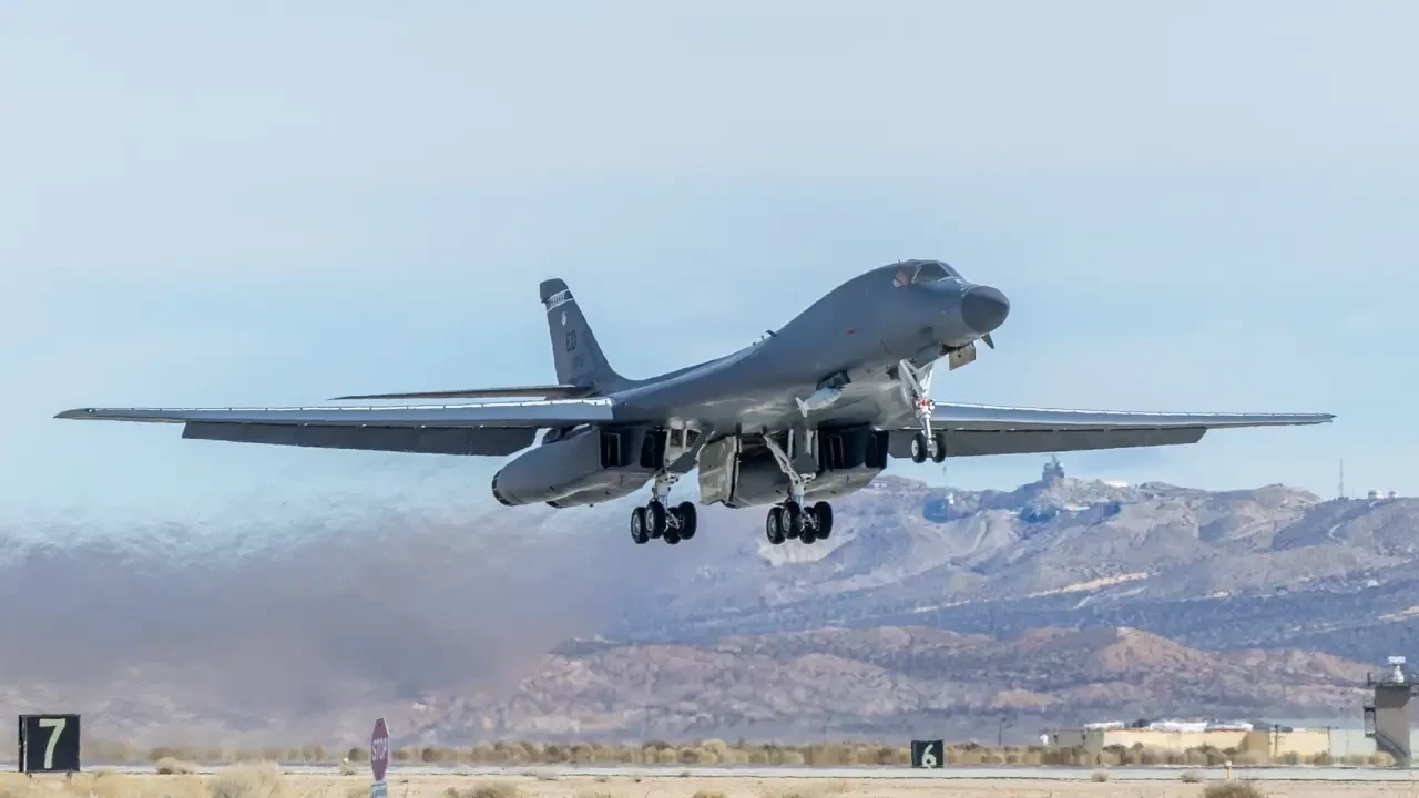 Бомбардировщик B-1B Lancer, приписанный к 419-й лётно-испытательной эскадрилье, вылетает с авиабазы Эдвардс, штат Калифорния, 15 февраля для проведения лётных испытаний модульной опоры с адаптивной нагрузкой