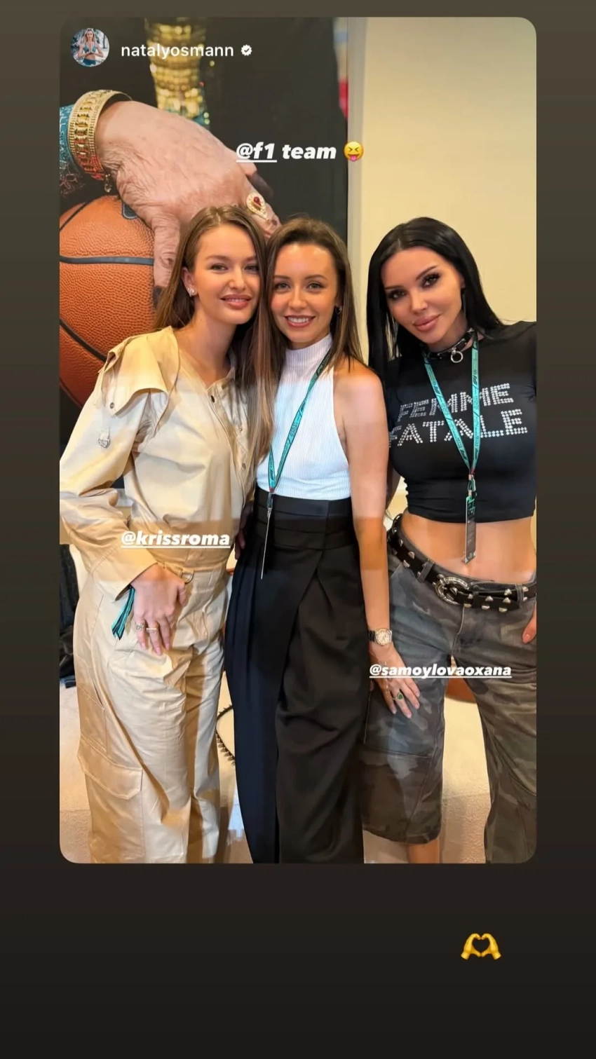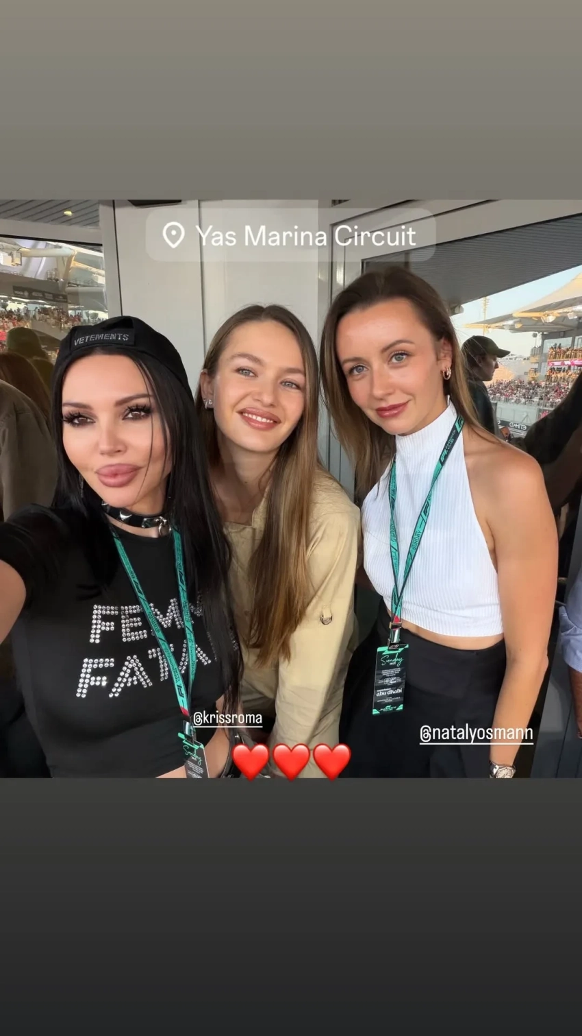 Джейсон Стэтхем и Эмили РатаковскиОксана Самойлова, которая разводится с мужем Джиганом, провела время в компании Натальи Османн и Кристины Романовой. Вместе они встретились со Стэтхемом, а также сфотографировались с моделью Эмили Ратаковски. Гонку также посетила внучка экс-президента Узбекистана Марьям Тилляева в компании своего жениха Арно и сын Валерии Арсений Шульгин с женой Лианой Волковой, которые в этом году стали родителями во второй раз.