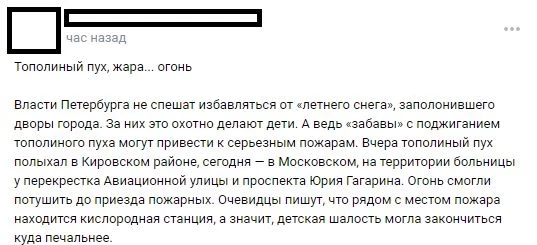«Власти Петербурга не спешат избавляться от «летнего снега», заполонившего дворы города. За них это охотно делают дети. А ведь «забавы» с поджиганием тополиного пуха могут привести к серьезным пожарам. Вчера тополиный пух полыхал в Кировском районе, сегодня — в Московском, на территории больницы у перекрестка Авиационной улицы и проспекта Юрия Гагарина. Огонь смогли потушить до приезда пожарных. Очевидцы пишут, что рядом с местом пожара находится кислородная станция, а значит, детская шалость могла закончиться куда печальнее»;