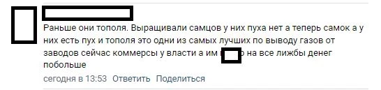 «Тополя одни из самых лучших деревьев по переработке газов от заводов. Раньше самцов тополя высаживали, у них пуха нет. Теперь самок, а у них есть пух. Сейчас коммерсанты у власти, а им плевать на все, лишь бы денег побольше», – жалуются петербуржцы.