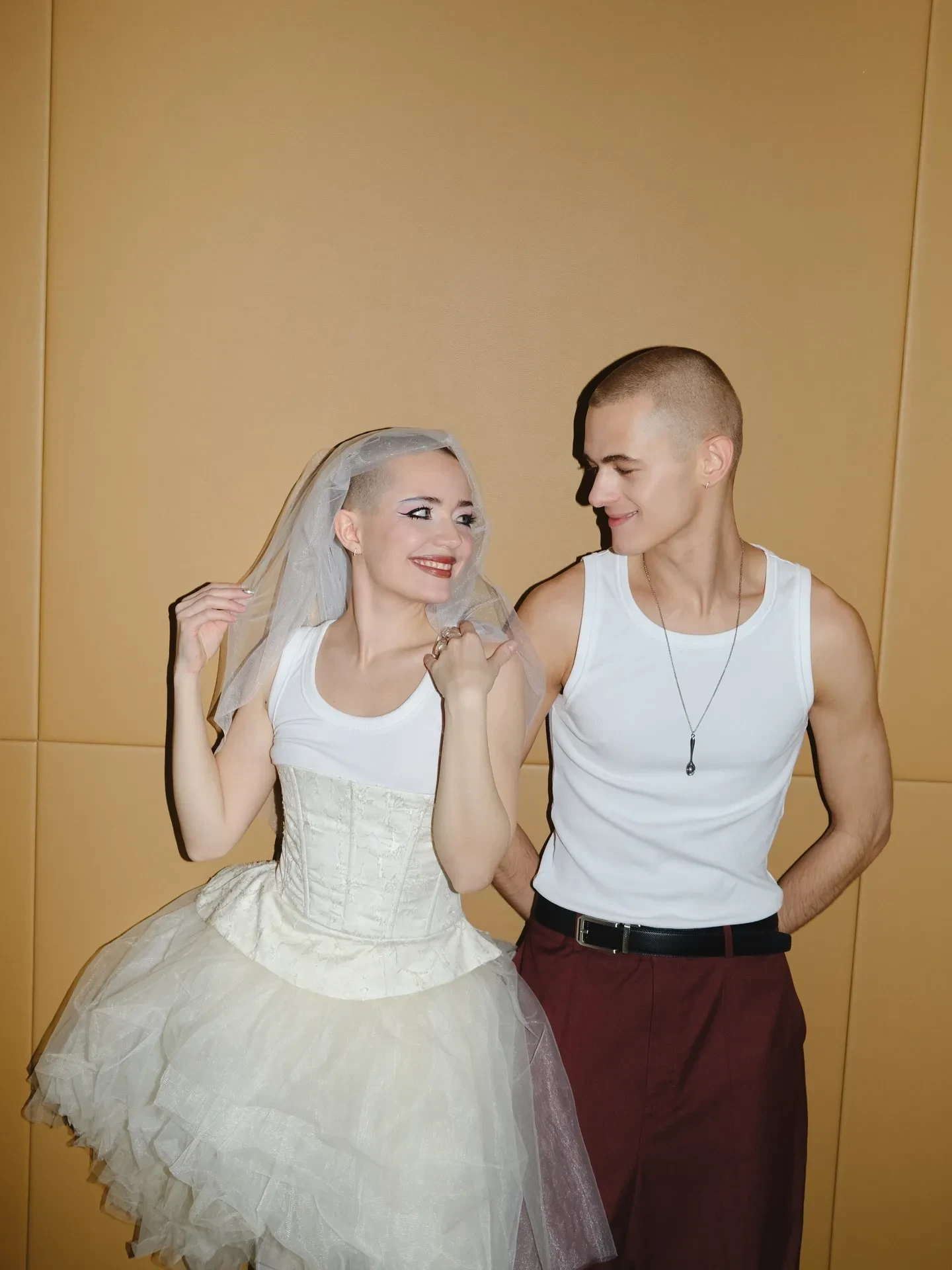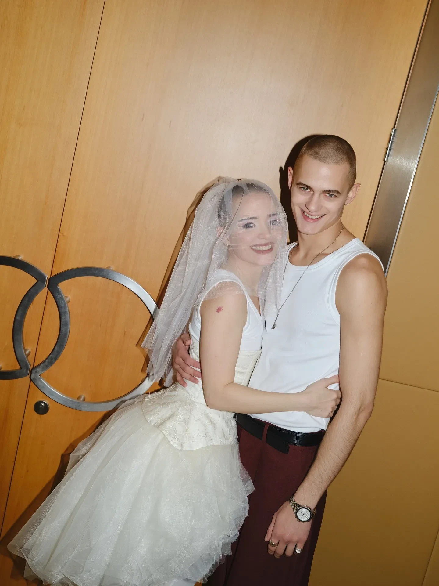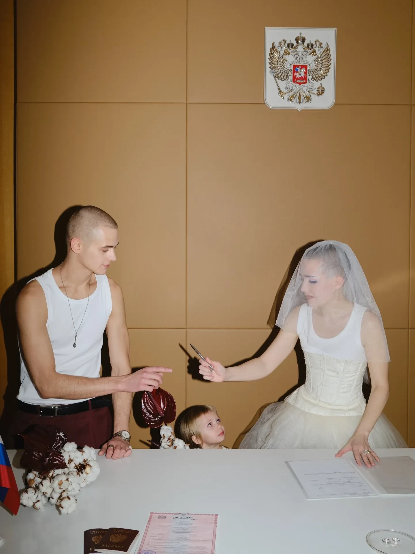 Пара расписалась в Дворце бракосочетания № 1 Москвы в кругу друзей и близких. Образы влюблённых отличались от привычных нарядов новобрачных: Авдотья выбрала пышную юбку, корсет, надетый поверх майки-"алкоголички", и чёрно-белые ботильоны, а Даниил пришёл в такой же майке и свободных брюках винного оттенка. Александрову и её избранника сопровождала дочь Авдотьи от прошлых отношений, Алексия. Девочка оделась в том же стиле, что и мама, и держала в руках похожий букет.