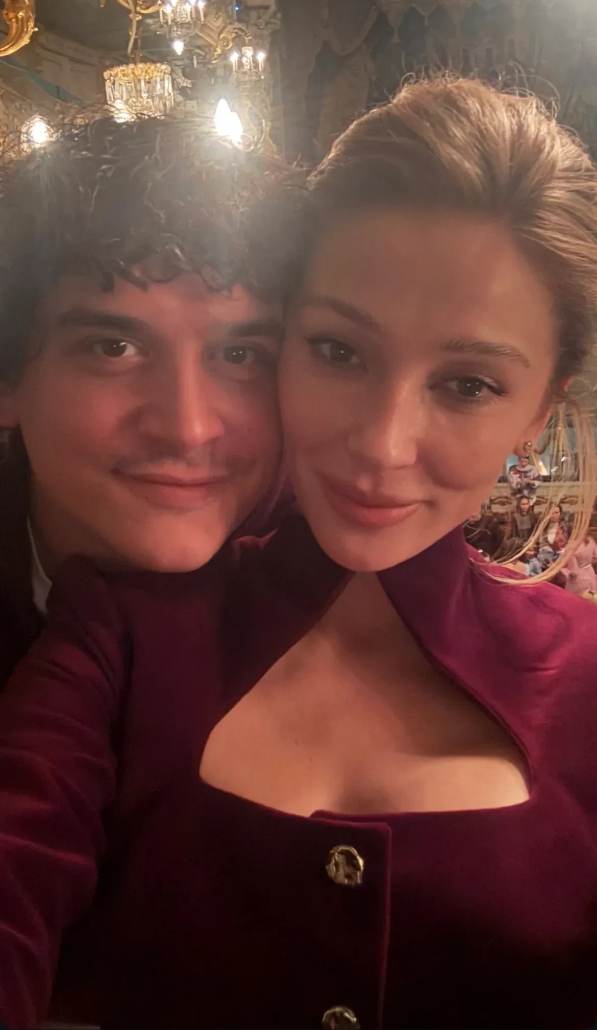 34-летняя блогер и ведущая выбрала для вечера наряд бордового цвета с декольте и причёску с убранными волосами. Ивлеева показала в соцсетях селфи с мужем из зрительного зала и фрагмент постановки.
