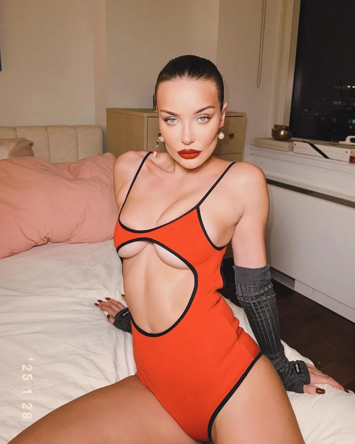 На снимке Коновалова сидит на бортике ложи в позе лотоса, предварительно сняв обувь. Для похода в театр она выбрала чёрный топ с глубоким декольте и красную мини-юбку. В подписи к фото 37-летняя модель написала: "Russia stay strong. Love you" ("Россия, оставайся сильной. Люблю тебя").