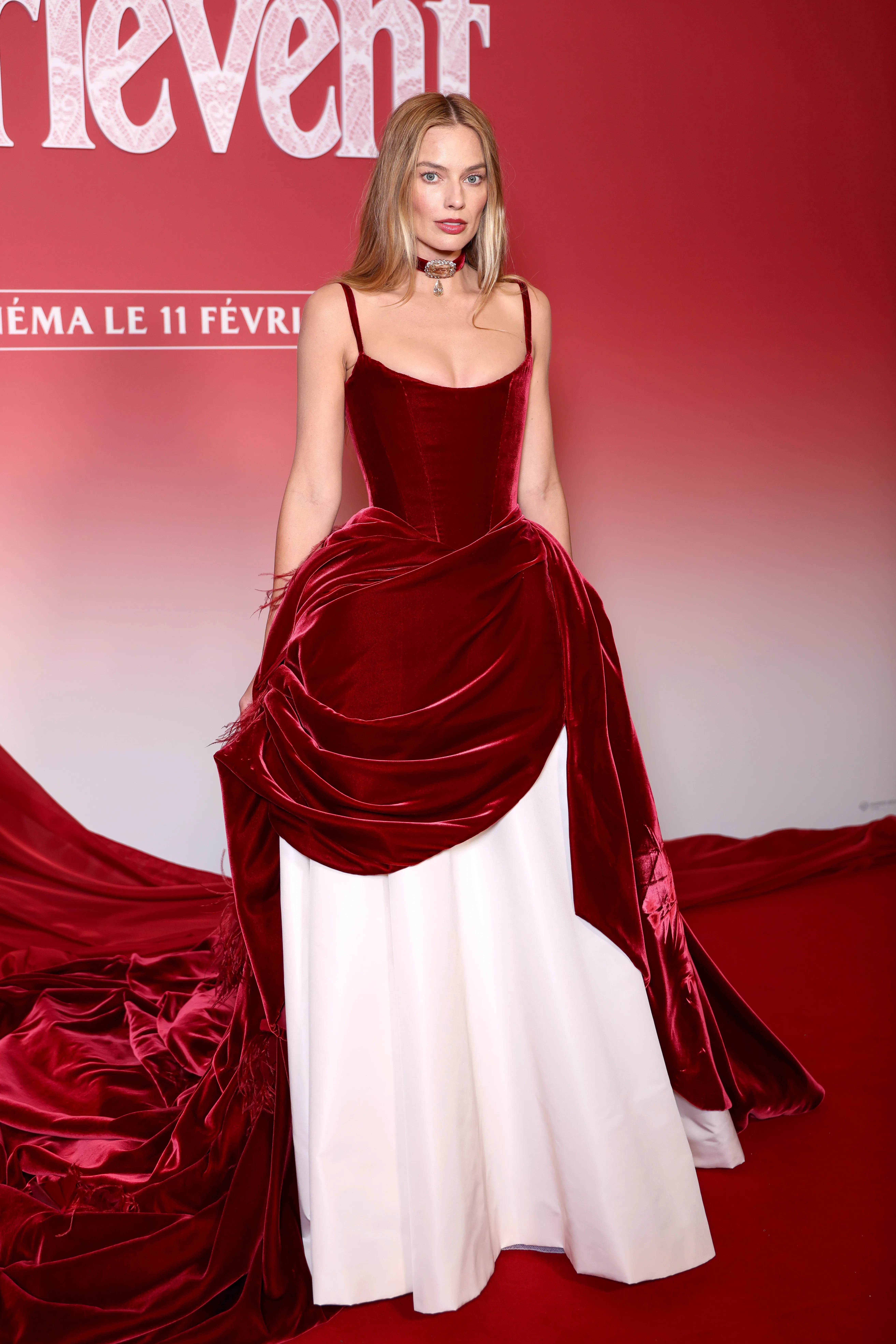 На красной дорожке 35-летняя актриса позировала в кастомном платье Chanel, вдохновлённым самой "красной дорожкой". Бархатный наряд глубокого алого цвета с длинным шлейфом был изготовлен лично Матье Блази по индивидуальному заказу. Образ Марго завершал чокер в винтажном стиле с драгоценными камнями.
