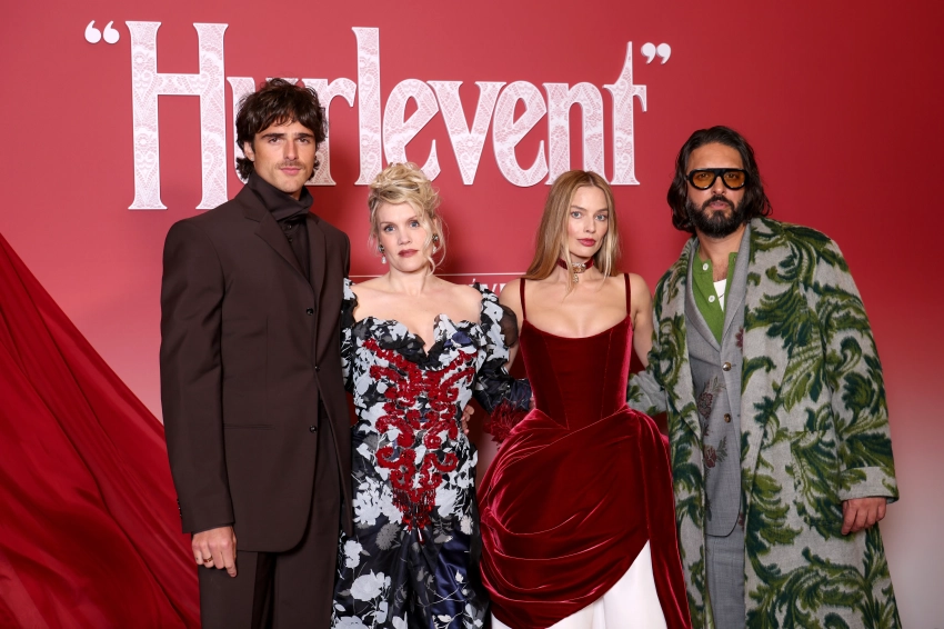 Джейкоб Элорди, Эмеральд Феннел, Марго Робби и Шазад ЛатифНа голливудской премьере картины Марго произвела фурор, появившись в платье Schiaparelli и колье Cartier, принадлежавшем Элизабет Тейлор. В числе гостей были дочь Риз Уизерспун Ава Филлипп, супермодель Кара Делевинь, певица Charli XCX, а также дочь Брюса Уиллиса и Деми Мур Скаут.