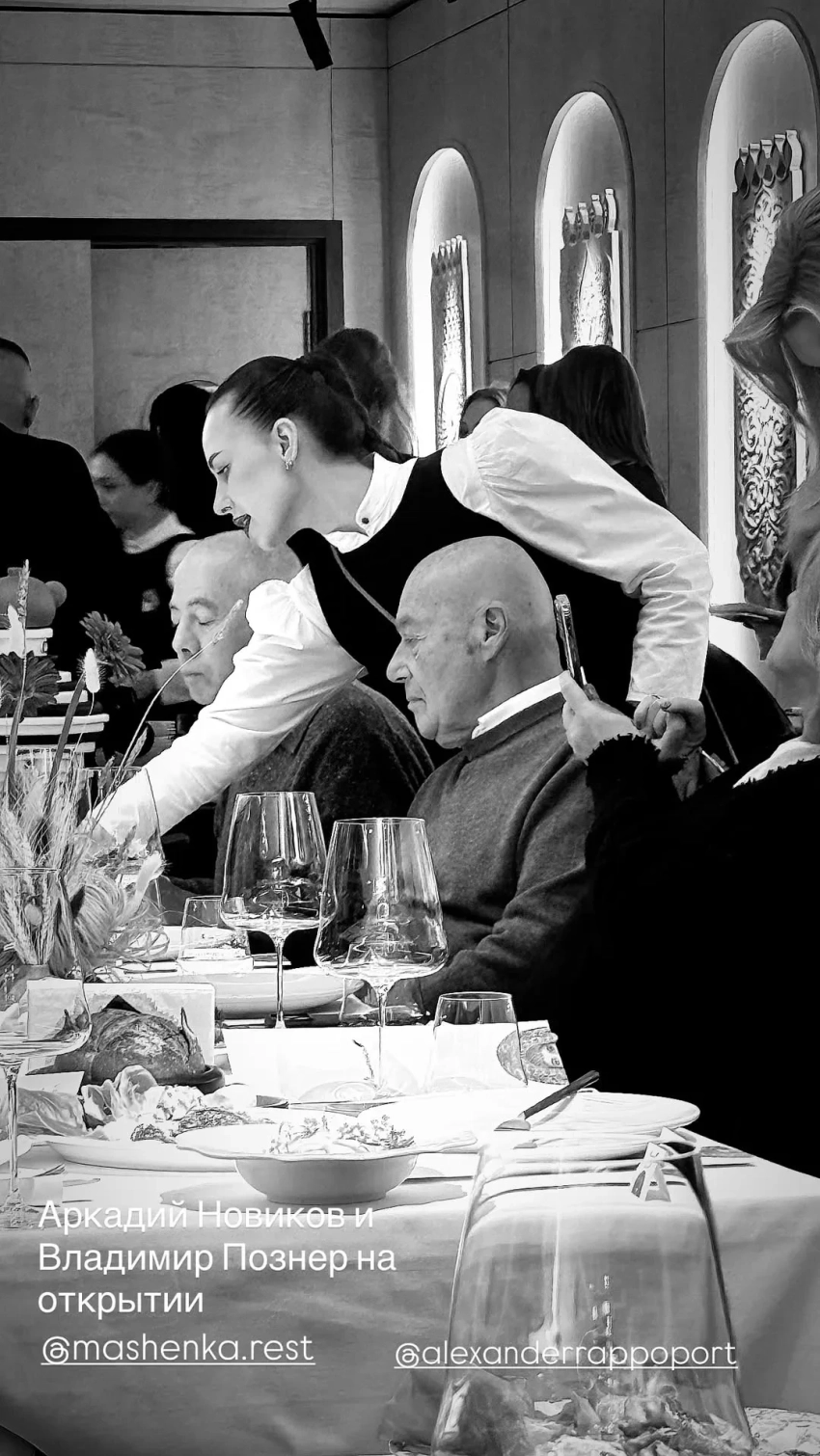 В Москве состоялось светское открытие ресторана Александра Раппопорта "Машенька". Гостями вечера стали Владимир Познер (который является партнёром Раппопорта по ресторану Geraldine) с женой Надеждой Соловьёвой, известный врач Марк Курцер, Ксения Собчак и Михаил Друян, который в последнее время редко выходит в свет.