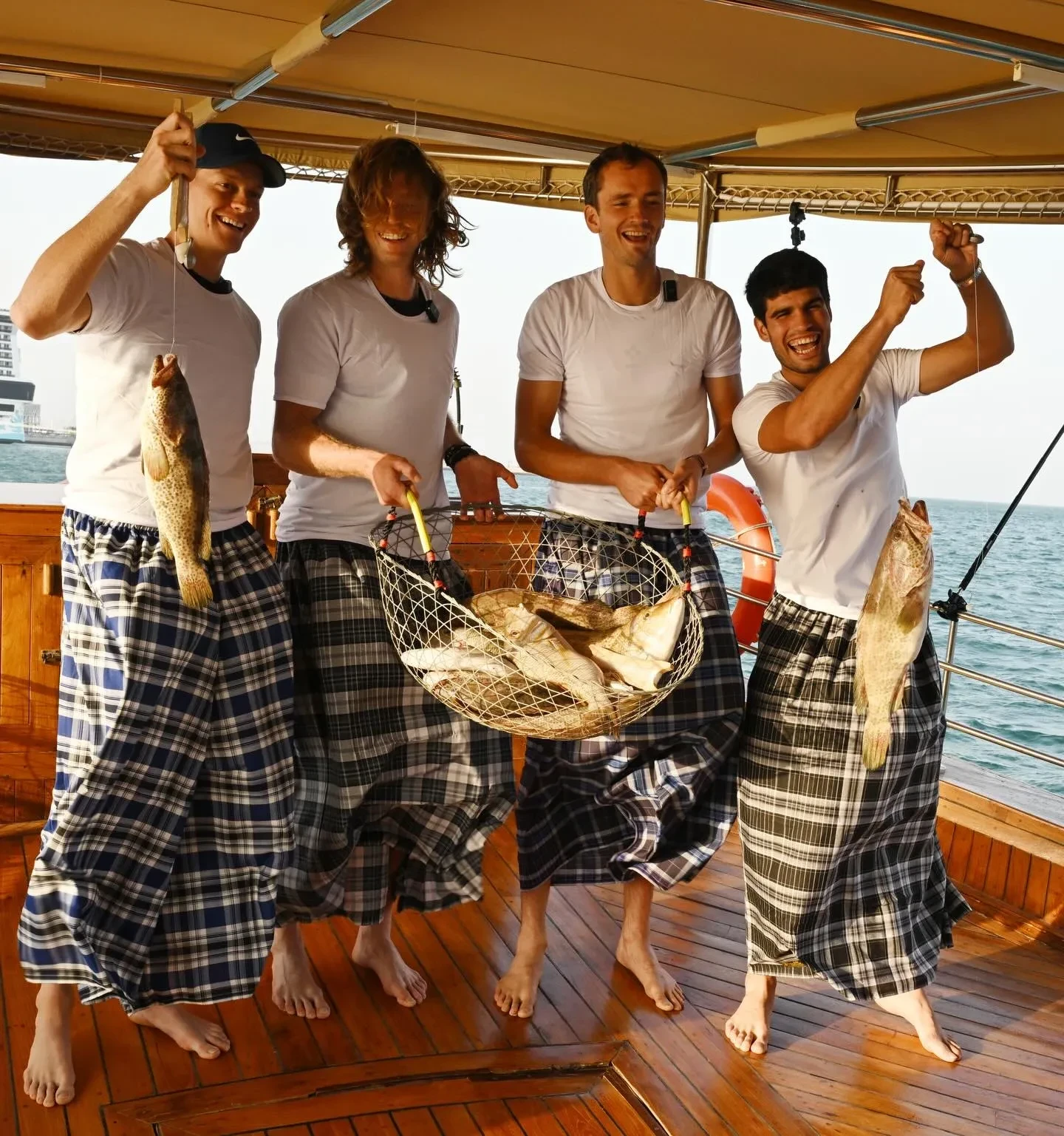 Перед тем как спортсменам провели инструктаж, они облачились в одинаковые наряды из белых футболок и клетчатых фут (мужская юбка, распространённая в арабских странах. — Прим. ред.). В противовес страстям на корте, улов удался у всех. "Это не ИИ, а просто парни, которые рыбачат в старом добром катарском стиле", — с юмором подписали организаторы пост.