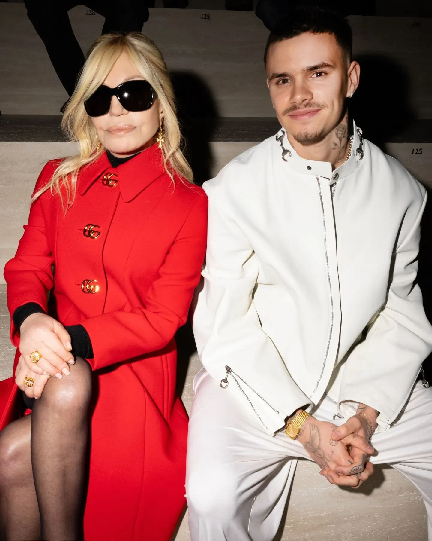 Рената Литвинова с дочерьюРената ЛитвиноваАрина СоболенкоАрина СоболенкоДонателла Версаче и Демна ГвасалияДонателла Версаче и Деми МурНадя Ли КоэнПэрис и Ники ХилтонНики и Пэрис ХилтонРомео БекхэмДонателла Версаче и Ромео БекхэмДжорджина РодригесДжорджина РодригесЕва ГерциговаАлессандро МикелеИзабелла ФеррариEsDeeKidПо подиуму в этот вечер прошлись сплошь звёзды. Сенсацией стал выход 52-летней Кейт Мосс в блестящем платье с экстремальным "декольте" на спине, открывающим стринги с логотипом. Супермодель дефилировала под песню итальянской дивы 1960-х Орнеллы Ванони Tu Si' Na Cosa Grande. В показе также приняли участие трансгендерная* дочь Илона Маска Вивьен Уилсон и Эмили Ратаковски.