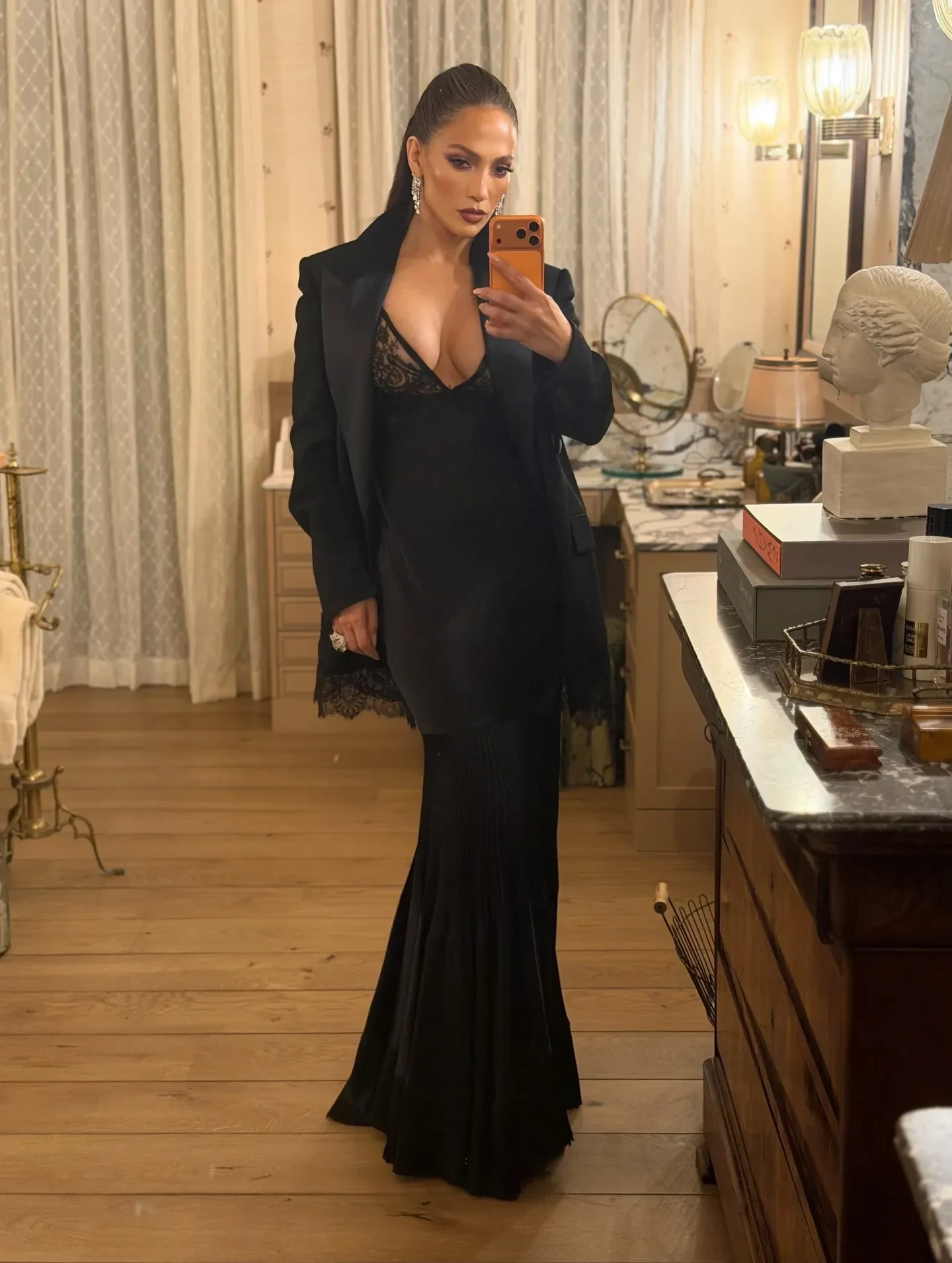 56-летняя Дженнифер Лопес, которая лично вручила почётному гостю вечера Керри Вашингтон награду "За мужество", выбрала для выхода в свет чёрное платье с глубоким декольте. Поверх она накинула классический жакет, а завершила образ бриллиантовыми украшениями. Певица, которая после развода с Беном Аффлеком намеренно решила выбрать жизнь "одиночки", не позировала на красной дорожке, но выступила на сцене с речью. 70-летняя матриарх семейства Кардашьян Крис Дженнер, чьё преображение до сих пор вызывает жаркие обсуждения в сети, появилась на концерте в закрытом платье с вышивкой и в основном держалась рядом с основательницей косметической фирмы Anastasia Beverly Hills Анастасией Суаре. В то же время 53-летняя София Вергара не поддержала тенденцию на чёрное и появилась в игривом платье с леопардовым принтом.
