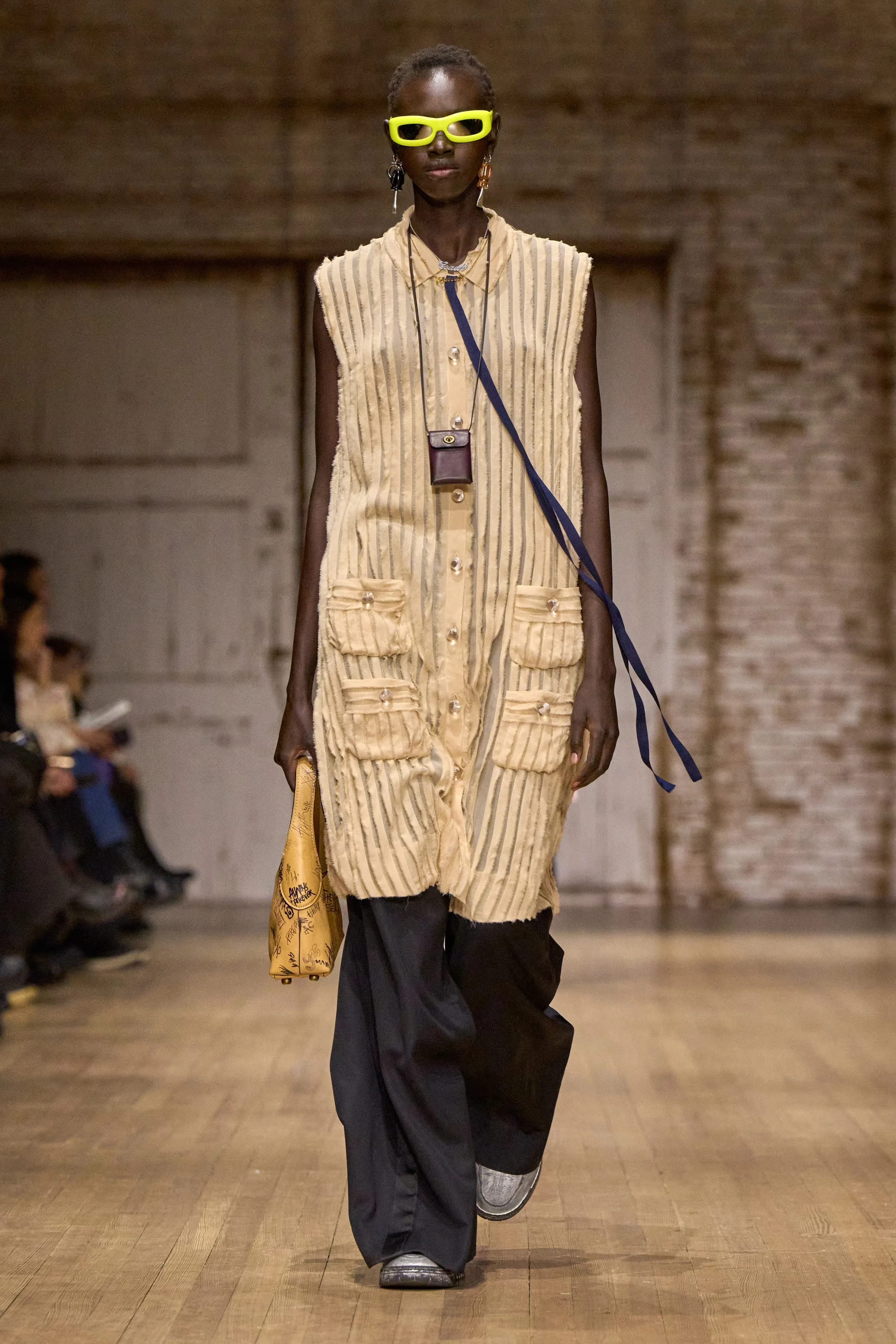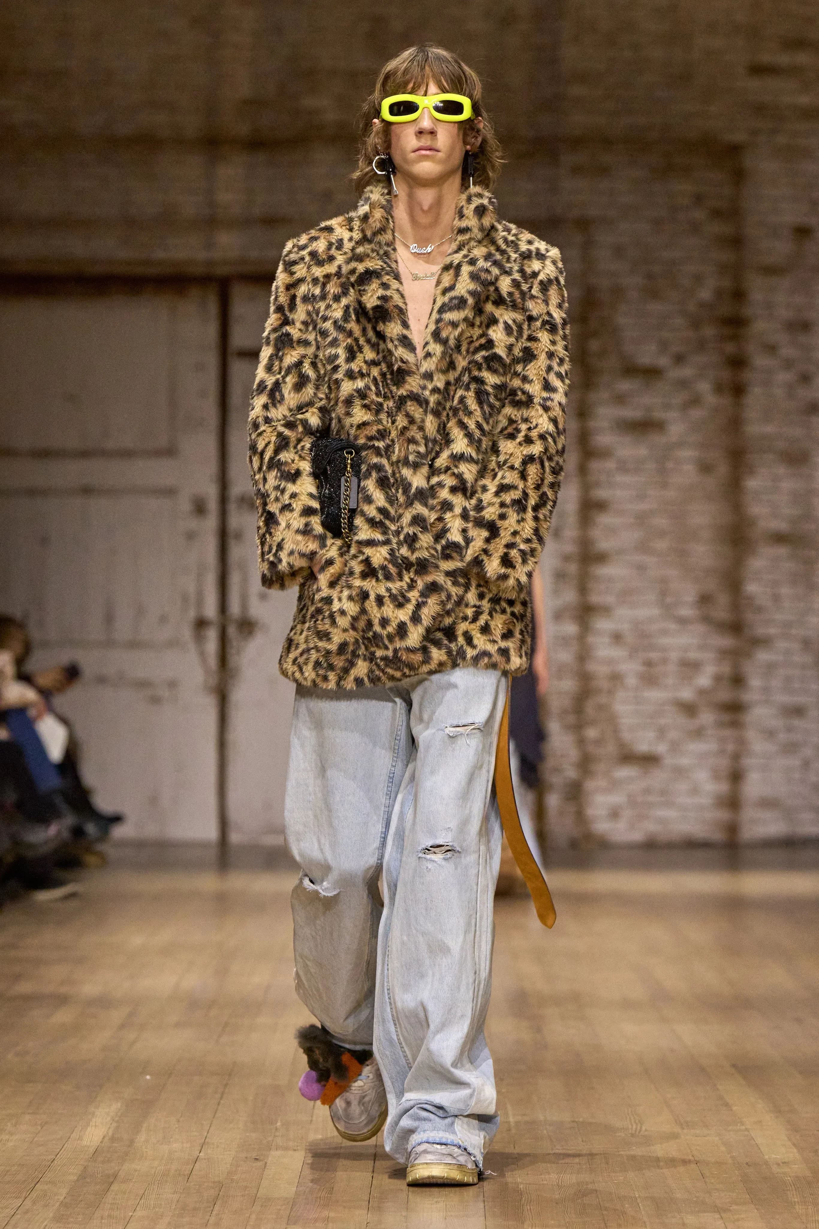 Леннон Галлахер/Фото: Dimitrios Kambouris/Getty ImagesНа подиуме преобладали вещи в уличном стиле расслабленного силуэта с отсылками к нулевым и детству: широкие брюки на низкой талии с тонкими ремнями, короткие косухи, длинные дублёнки, яркие очки в пластиковых оправах, плюшевая обувь, "разрисованные" футболки, жилетки с "заплатками", леопардовые шубы, сумки-медальоны и брелоки в виде игрушек. В прошлом году бренд оказался в списке самых успешных в рейтинге Lyst и стремительно набирает популярность среди зумеров.