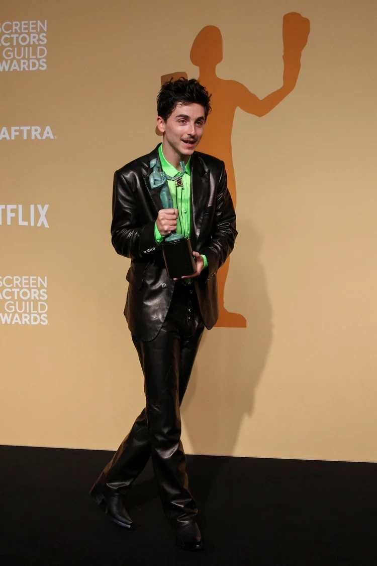 Тимоти Шаламе, который стал обладателем награды в номинации «Лучшая мужская роль» за фильм «Никому неизвестный», пришел на премию вместе с мамой. Николь очень радовалась победе сына. Для выхода на дорожку 29-летний Тимоти выбрал кожаный костюм от американского люксового бренда Chrome Hearts, который сочетал с кислотно-зеленой рубашкой и ковбойским галстуком.