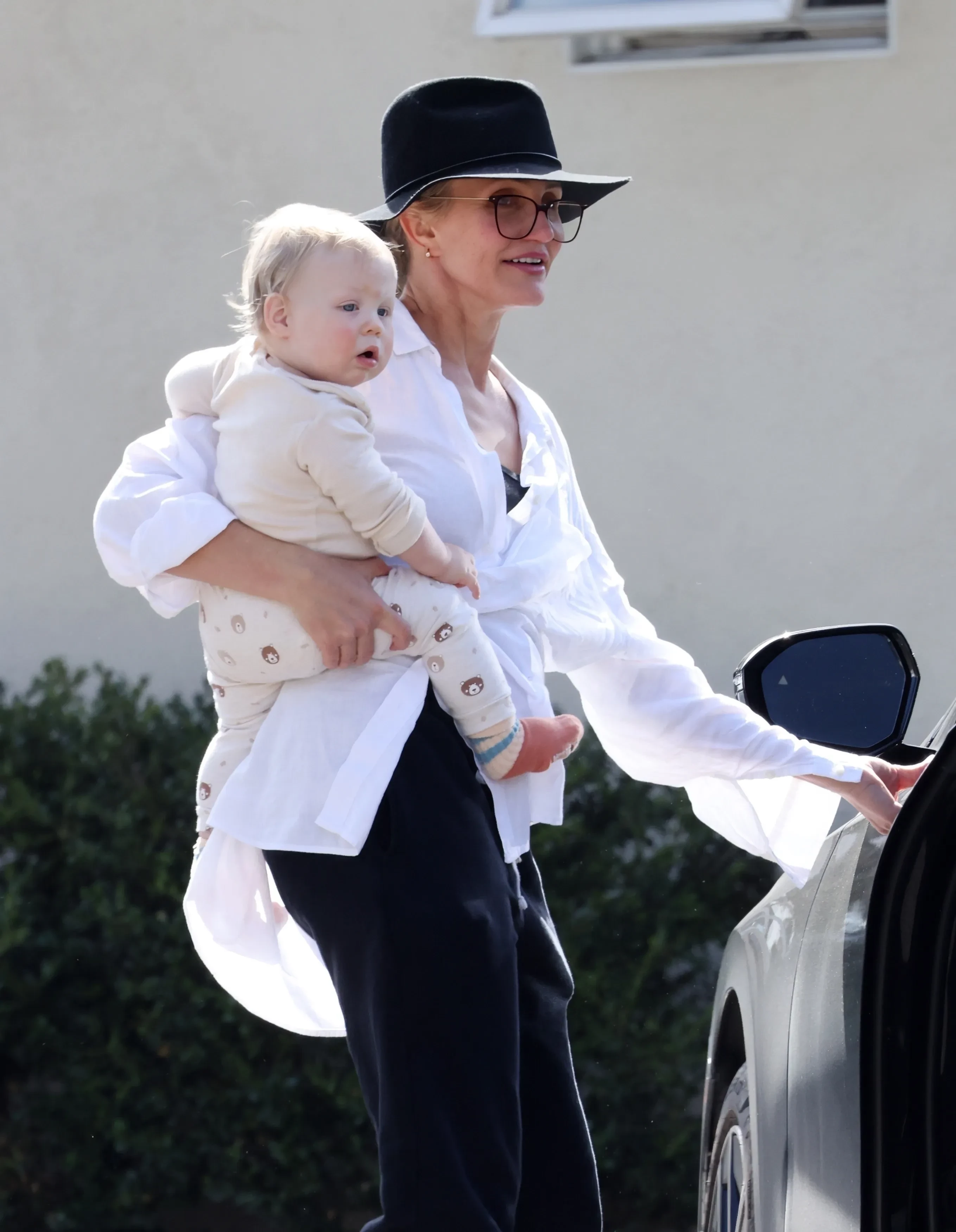 Для появления на публике Диас выбрала чёрные брюки и шляпу в тон, а также свободную белую рубашку. Сына она несла к автомобилю на руках.