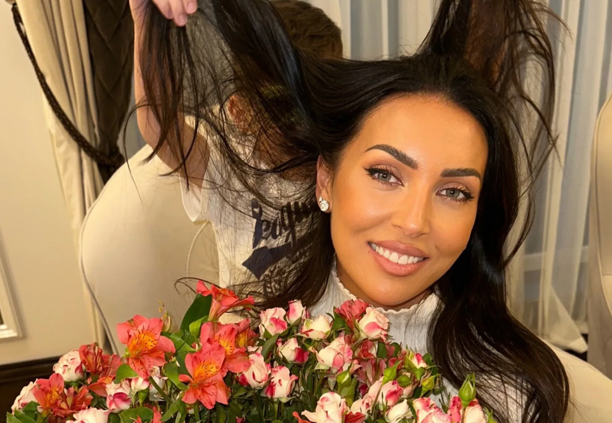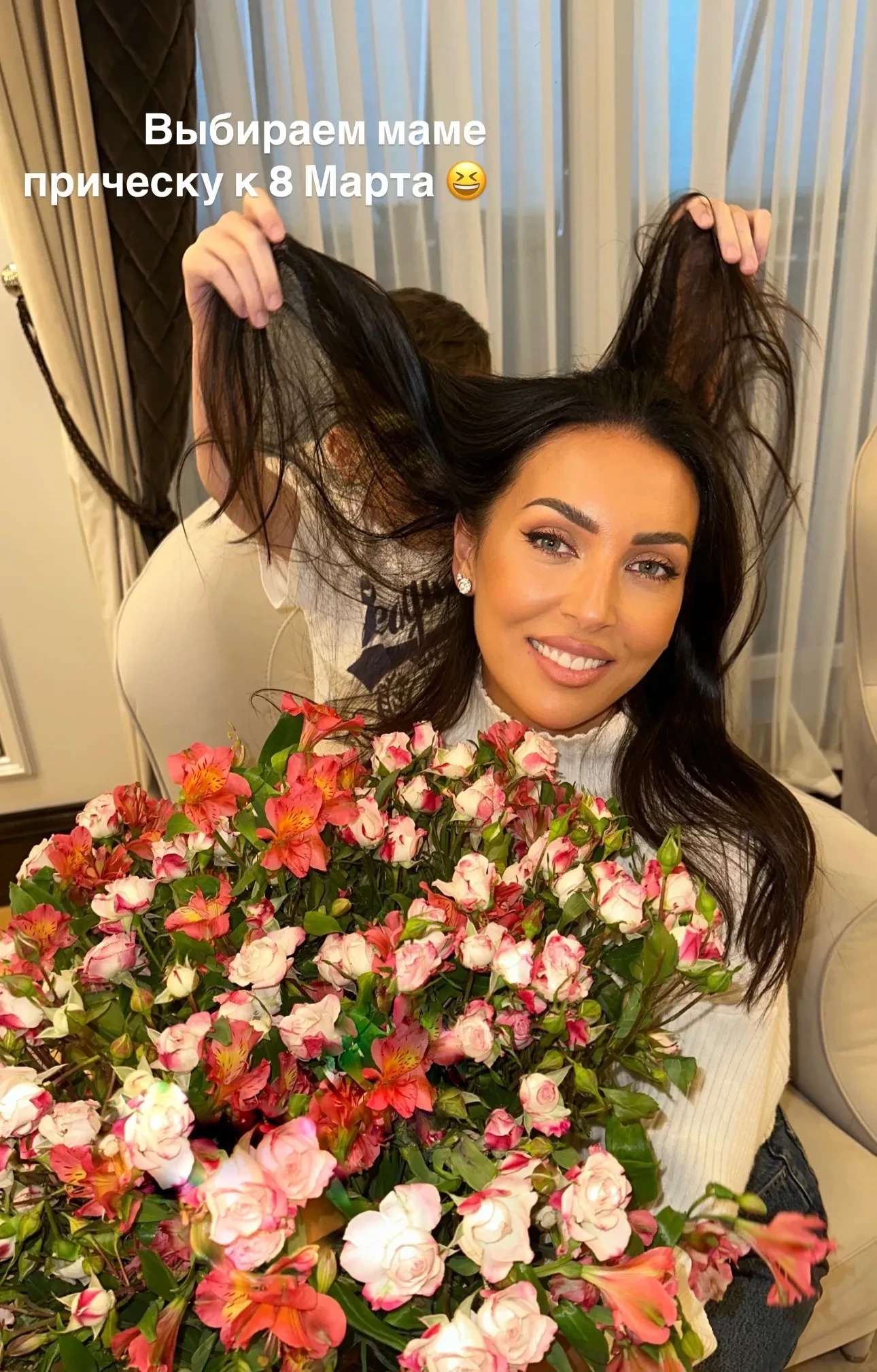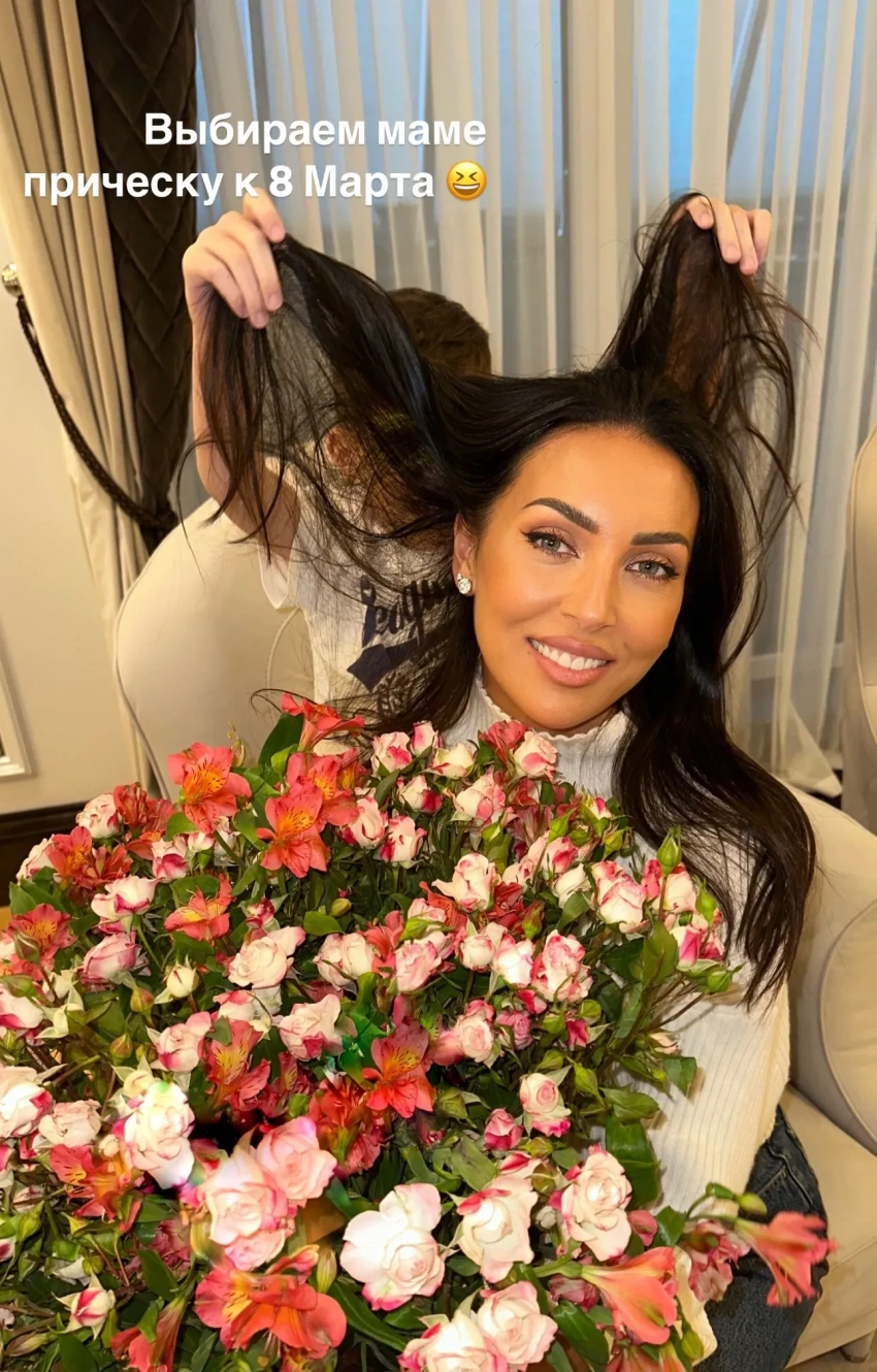 На снимке Алсу позирует вместе с Рафаэлем, мальчик делает маме причёску. Певица практически не показывает лицо сына: на этой фотографии оно скрыто волосами матери. "Выбираем маме причёску к 8 Марта", — подписала Алсу фотографии.