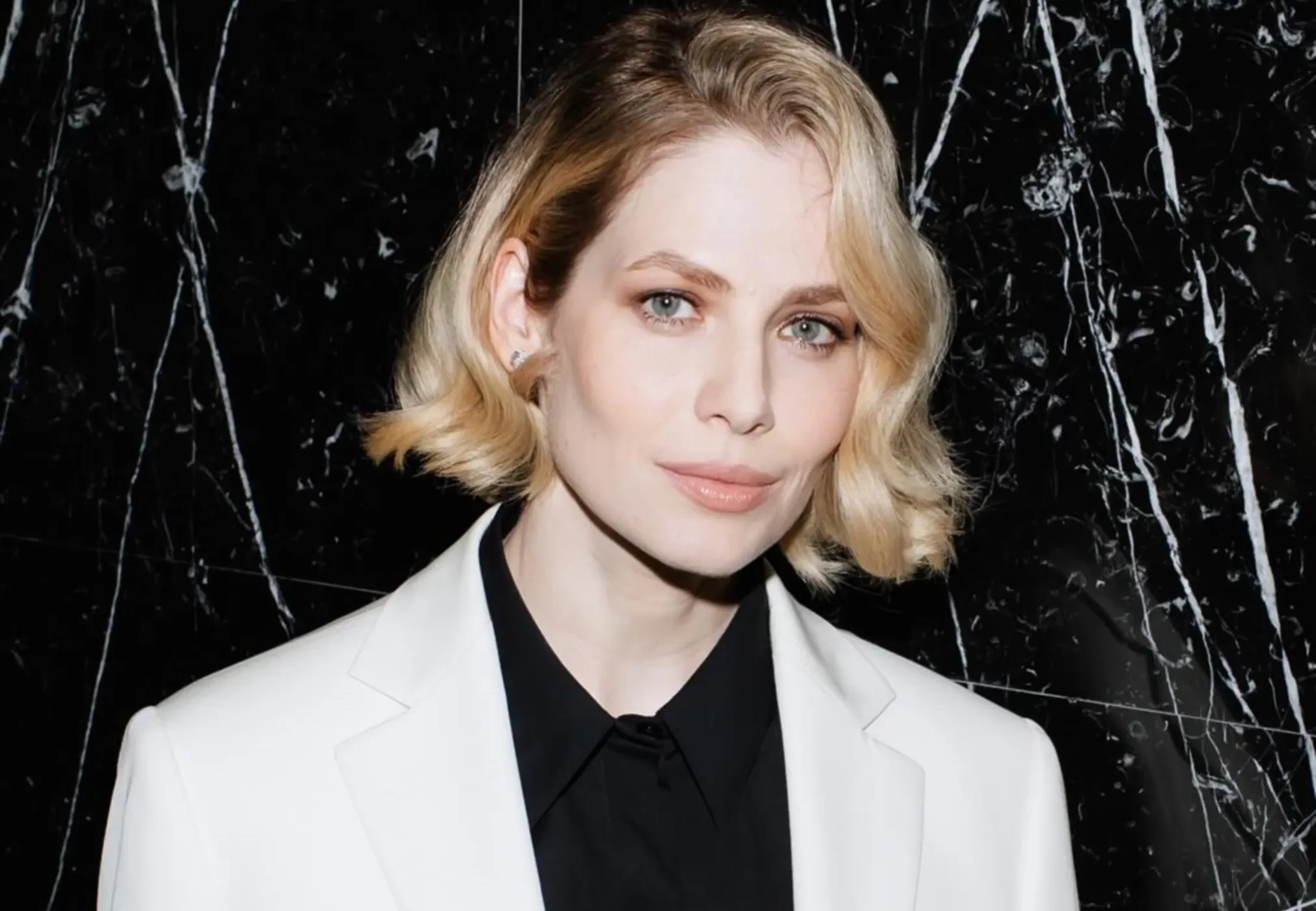 Для выхода в свет 41-летняя актриса выбрала белоснежный костюм с прямыми брюками и приталенным жакетом, который она надела поверх чёрной рубашки. Дополнили образ ремень с золотой пряжкой и лакированные туфли-лодочки в тон, а акцентом образа стал новый цвет волос, которые Снигирь уложила в мягкие волны.