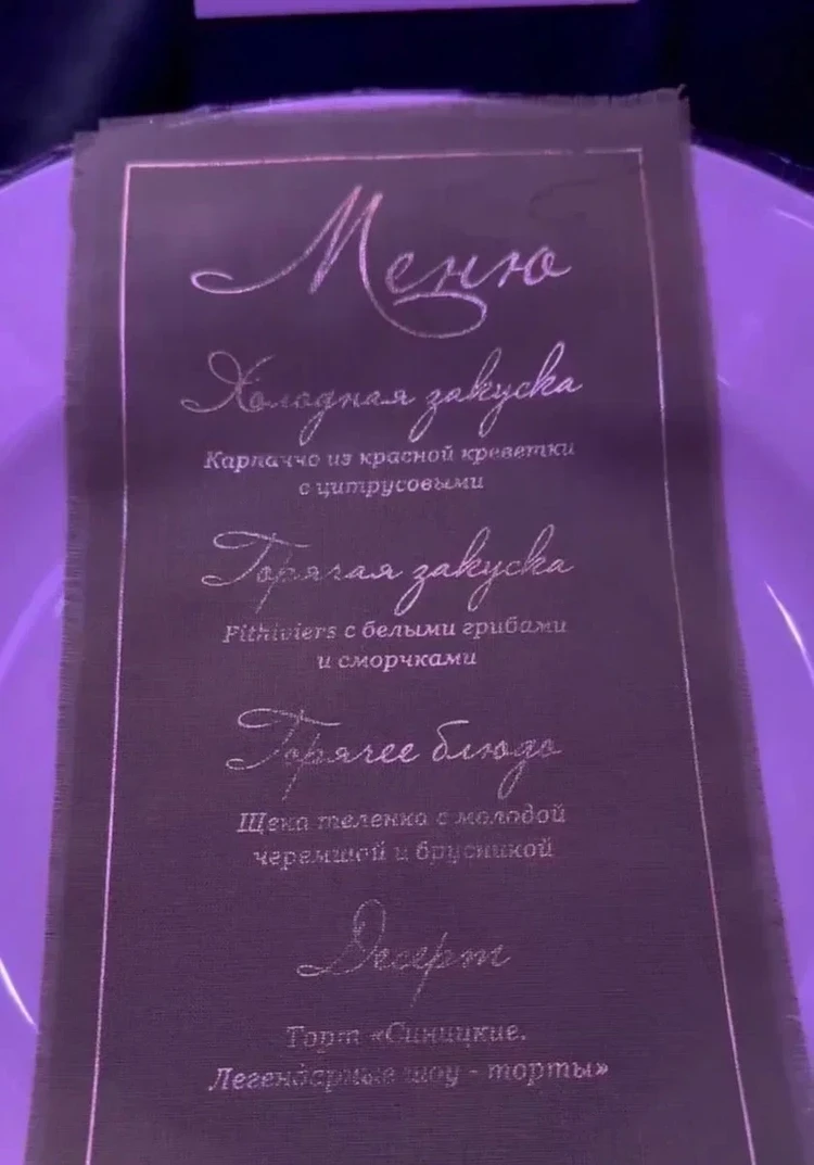 В этот вечер гостям именинницы подавали карпаччо из красной креветки с цитрусовыми, питивье (французский закрытый пирог — Ред.) с белыми грибами и сморчками, а также щечки теленка с молодой черемшой и брусникой.