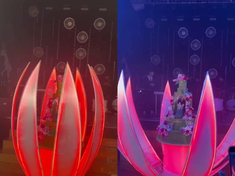 В конце праздника на сказочной поляне расцвел огромный механический цветок в человеческий рост. К гостям вывезли красный бутон, который раскрылся под аплодисменты. Внутри скрывался главный десерт праздника — огромный зеленый торт, украшенный сахарными цветами и фигуркой Рудковской в виде феи с крыльями.