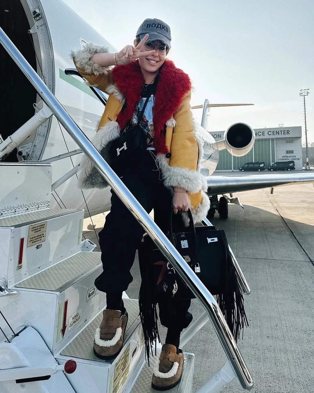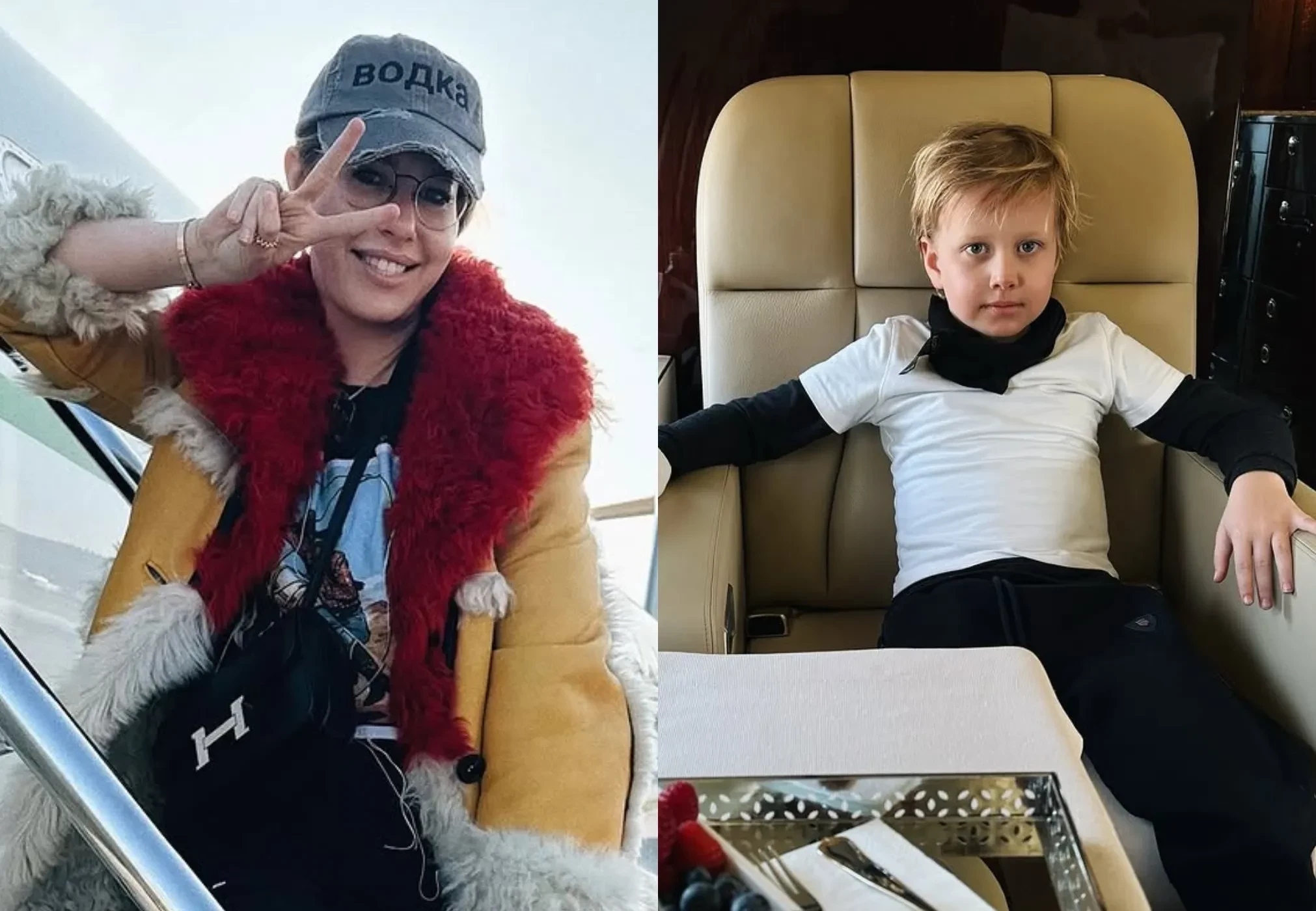 На снимках Собчак позирует у частного самолёта в дублёнке с цветным мехом, в кепке с надписью "Водка" из коллаборации концепт-стора KM20 с брендом Alexander DiGenova и с двумя сумками Hermes. На борту звезду и её восьмилетнего сына от экс-супруга Максима Виторгана встречали с цветами и угощениями.