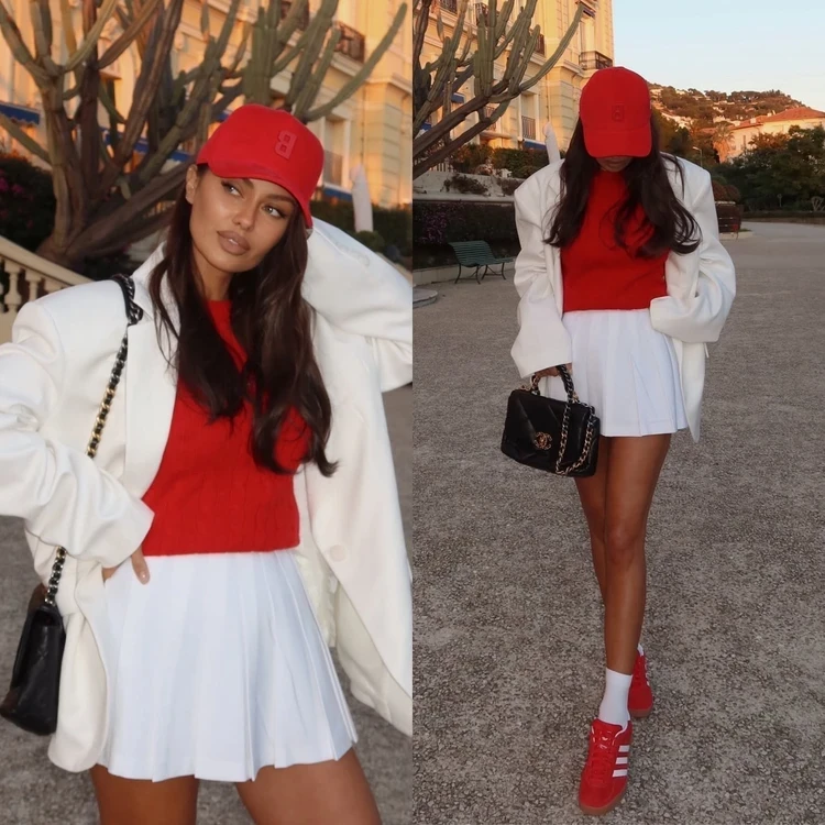 Виктория демонстрирует образ в духе tennis core на каждый день. Боня делает ставку на эффектное сочетание красного и белого цветов. Кокетливую юбку плиссе в теннисном стиле блогер комбинирует с трикотажным джемпером и объемным жакетом. Дополняет образ еще одним неотъемлемым атрибутом tennis core — кедами с белыми носками. И завершающие штрихи — бейсболка от бренда Бони и сумка Chanel.