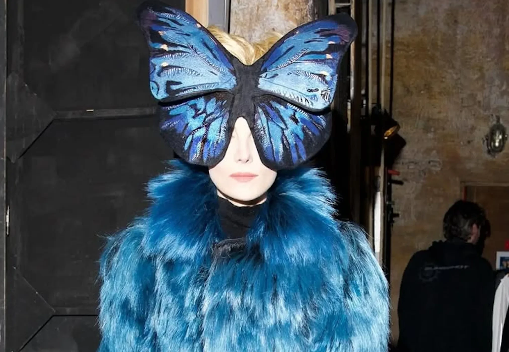 Рената Литвинова вышла в свет в синей шубе и с "бабочкой" на голове