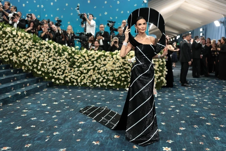 На фоне многих гостей 62-летняя Деми Мур выглядела выигрышно. На актрисе было черное платье с пайетками с контрастными белыми полосками с каркасом, который возвышался над головой. Издалека казалось, что Деми пришла в большой шляпе.