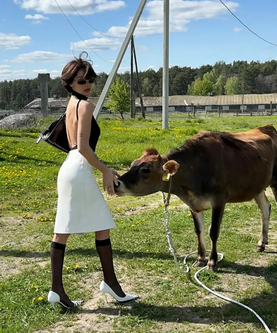 Так, на одном из снимков блогерша позирует, стоя перед трактором, а на другом — рядом с коровой.