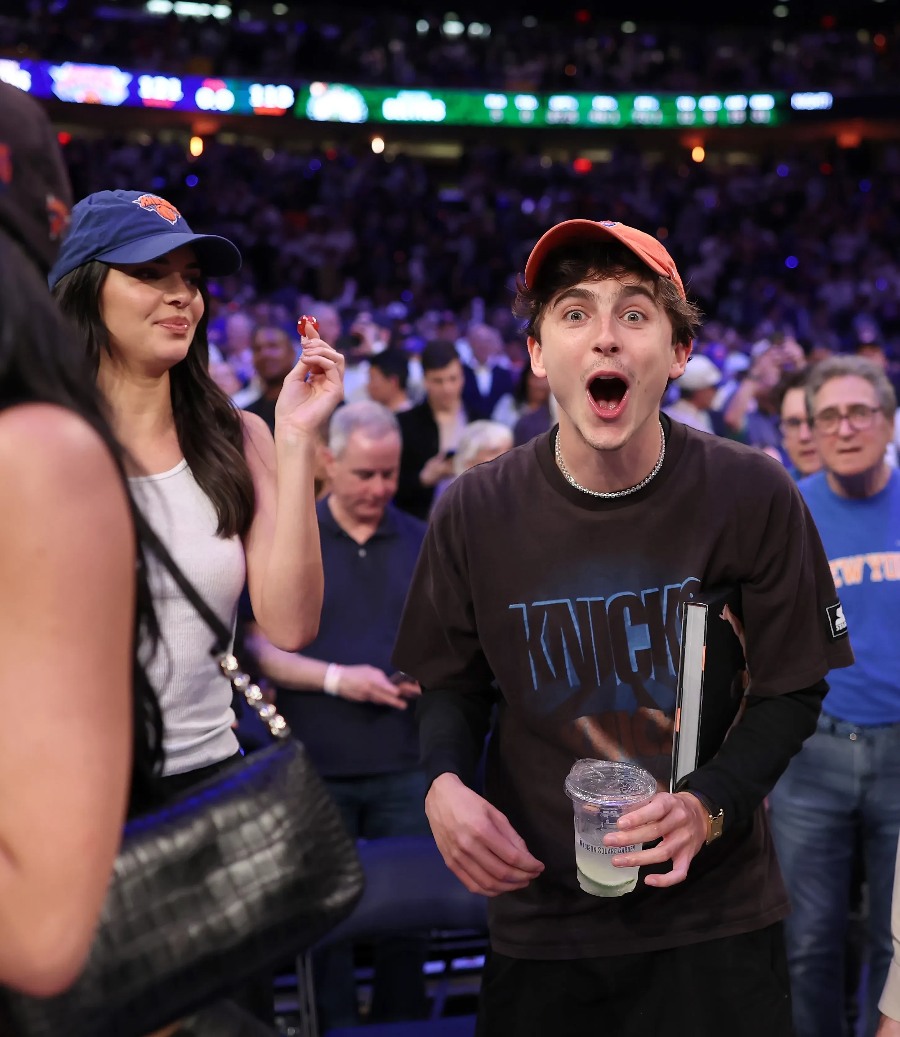 Тимоти Шаламе вместе с возлюбленной Кайли Дженнер и её 29-летней сестрой, супермоделью Кендалл Дженнер, посетили баскетбольный матч в Нью-Йорке. Компания наблюдала за игрой в первом ряду, где 29-летний голливудский актёр сидел между сёстрами. Пока Тимоти болел за свою любимую команду Knicks, 27-летняя Кайли с улыбкой смотрела на него.